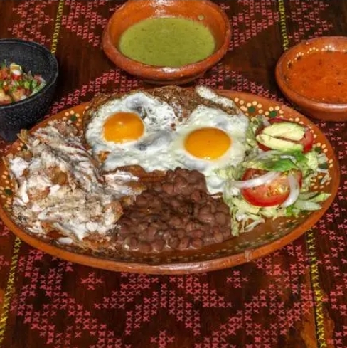 Clásico desayuno mexicano a base de totopos, de maíz bañados en salsa roja, con crema, queso, pico de gallo y acompañados de huevos estrellados y frijoles.