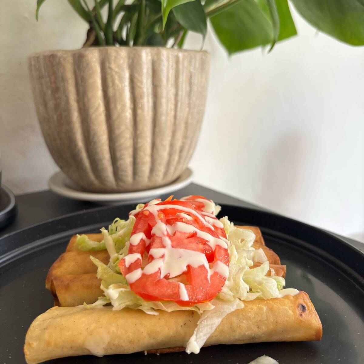 Tortilla dorada rellana de pollo con legua, jitomate y cebolla por encima y bañados en crema y queso