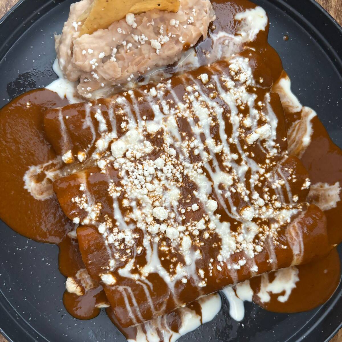 Tortilla de maiz rellena de pollo, bañada de mole casero, crema y queso fresco
