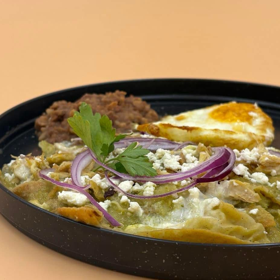 Totopos caseros bañados en salsa verde con crema, queso y frijoles.