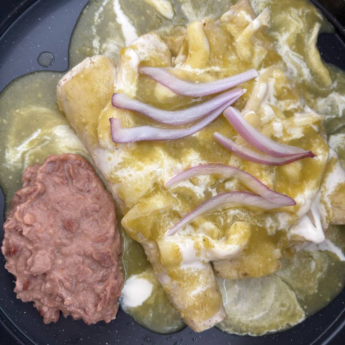 Tortilla rellena de pollo, bañadas en salsa verde casera con crema y queso