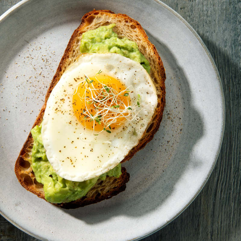 Pan integral crujiente cubierto de aguacate maduro con pimienta y limón, complementado con un huevo estrellado.