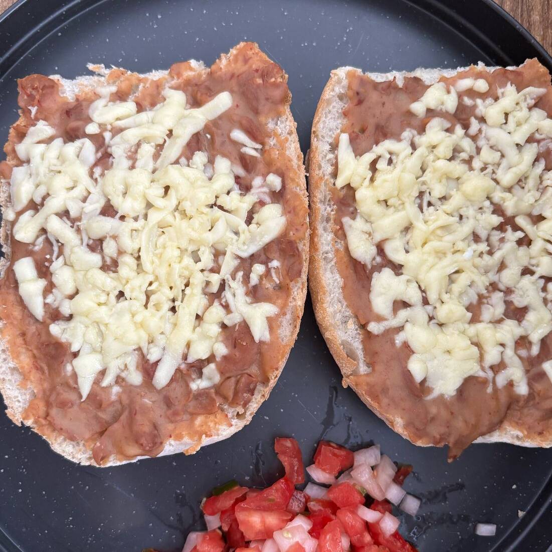 Bolillo crujiente con frijoles caseros y queso derretido, acompañados de una rica salsa de pico de gallo