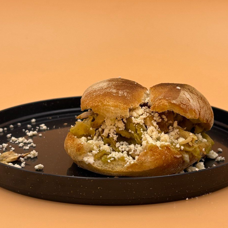 Bolillo relleno de chilaquiles verdes con crema y queso