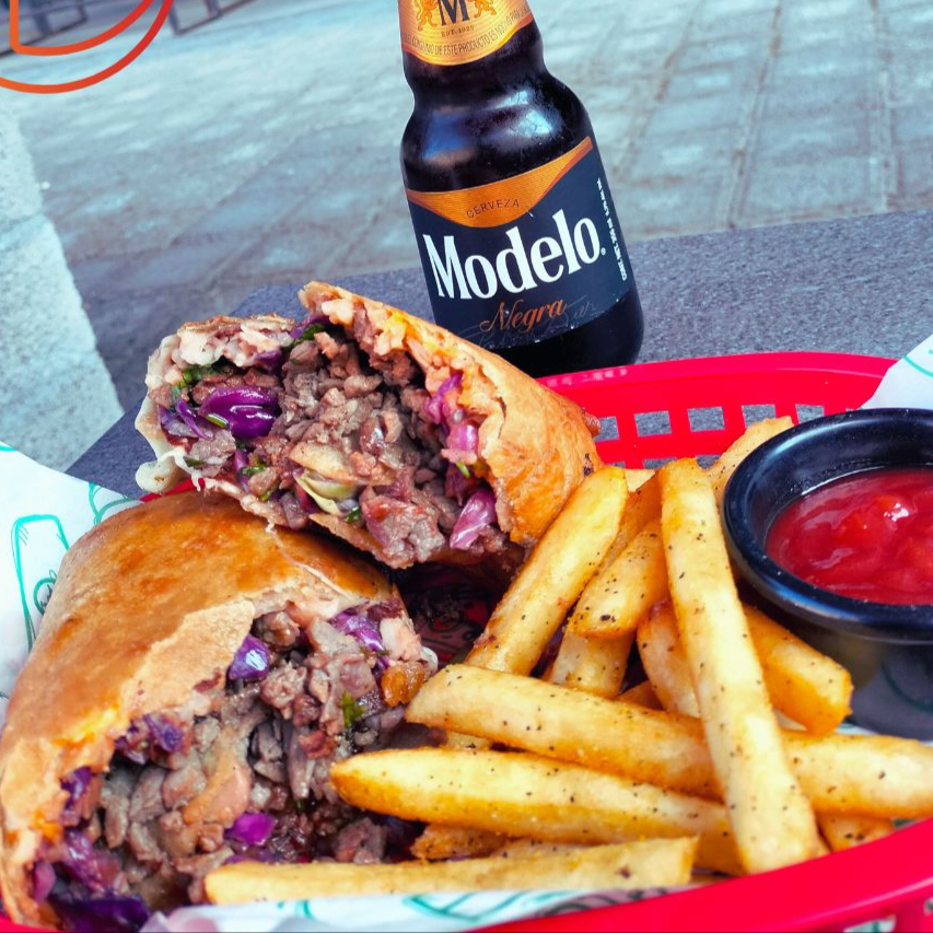 Carne a elegir, frijoles, queso amarillo, queso asadero, cebollitas asadas y se acompaña con aderezo de chipotle