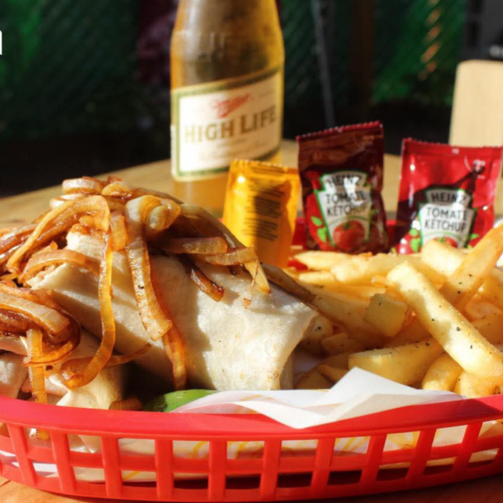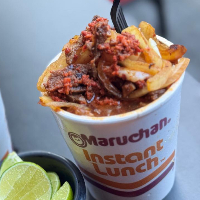 Maruchan con boneless, queso asadero, papas a la francesa y cebollitas asadas
