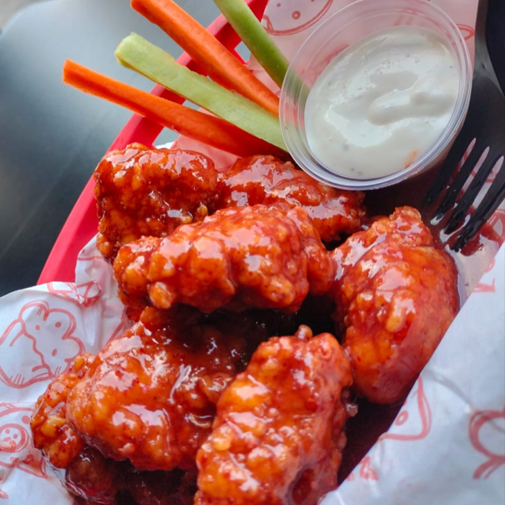 Boneless con tu salsa favorita acompañados de vegetales y aderezo