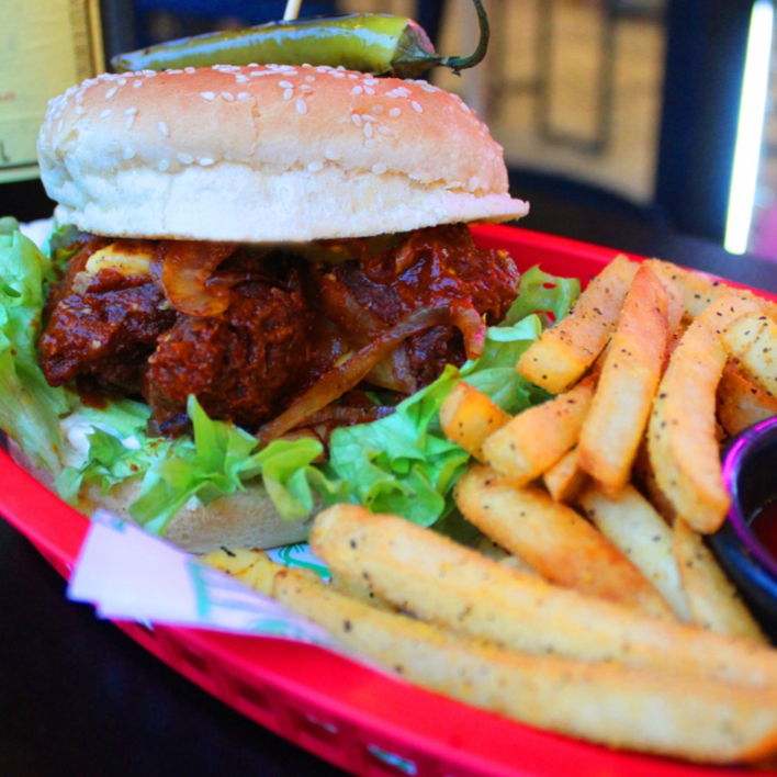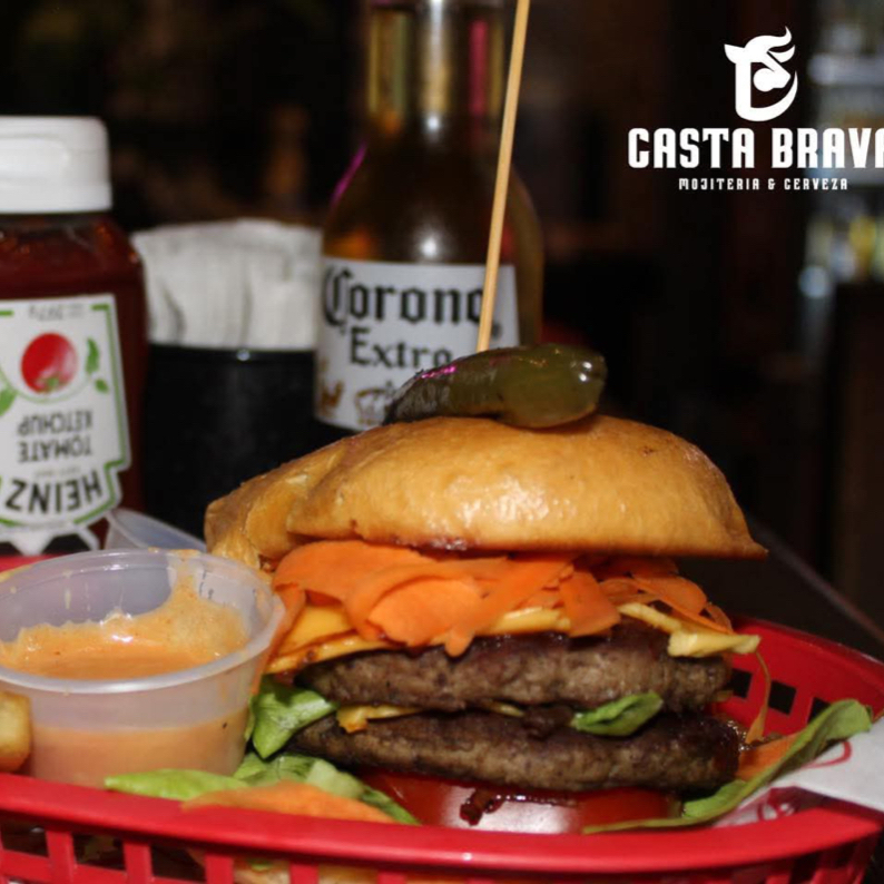 Carne de res , mayonesa, catsup, mostaza, lechuga, jitomate, cebolla asada, queso amarillo, aderezo de chipotle, pepinillos, zanahoria rallada