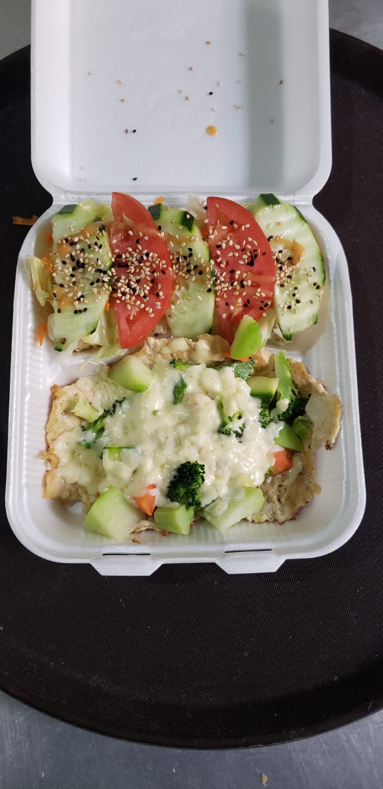 Pollo, jamón, queso, pepino, jitomate y verduras cocida sobre frescas hojas de lechuga, acompañada con aderezo de la casa y ajonjolí.