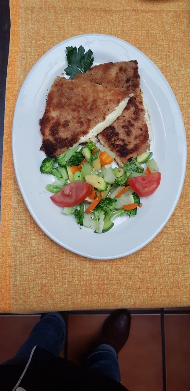 Milanesa rellena de jamón con queso manchego, guarnición de verduras al vapor y puré de papa.