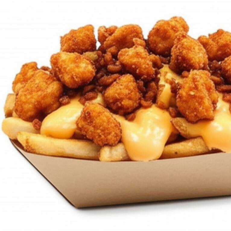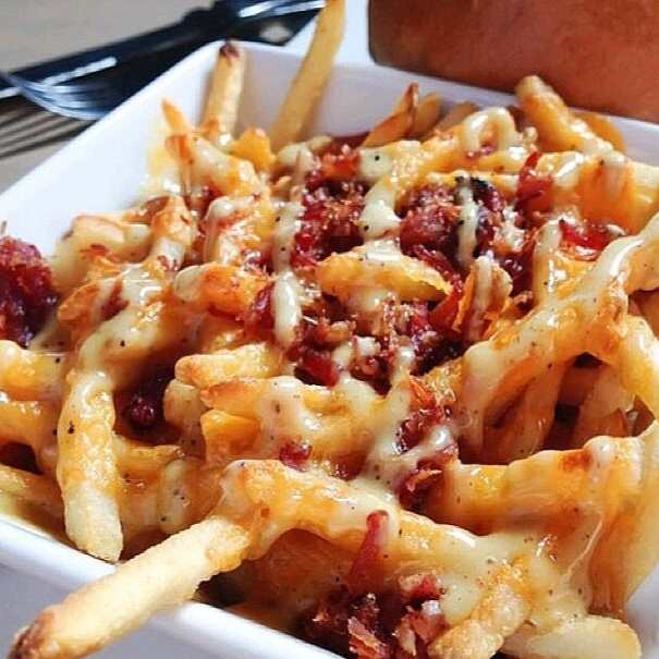 Papas fritas con queso cheddar caliente y Tocino opcional