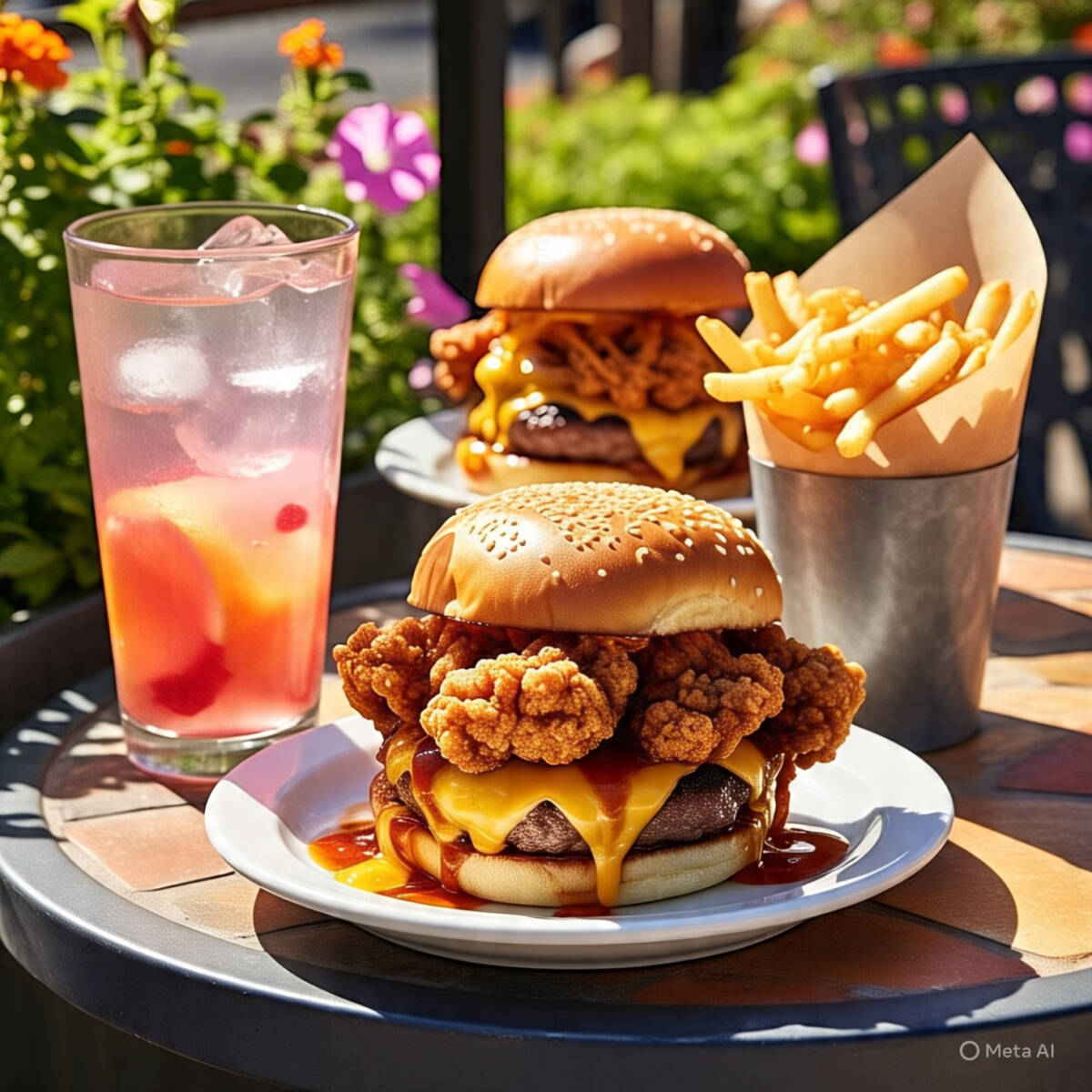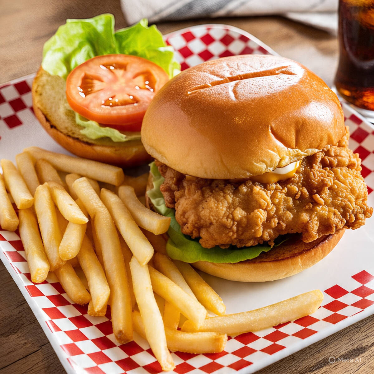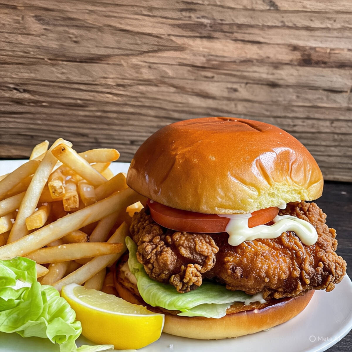 Pollo frito con lechuga, jitomate, cebolla y liquidos en un pan tipo brioche