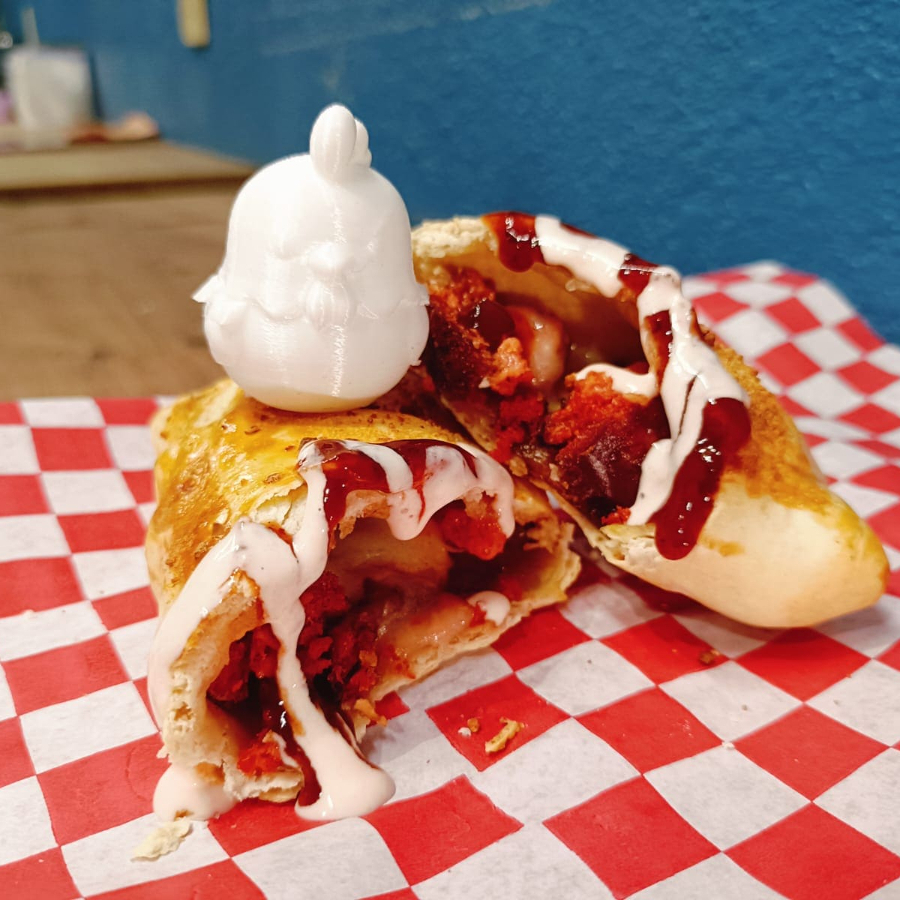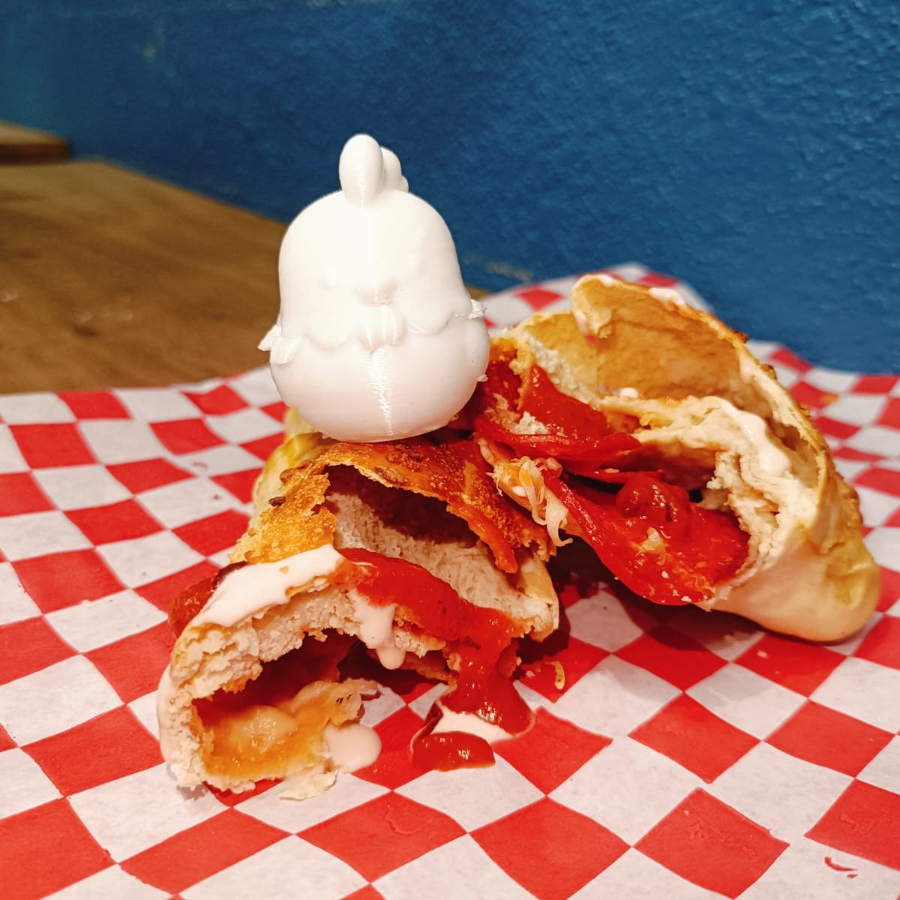 pan de la casa horneado y relleno de pollo marinado a la plancha con salsa de la casa, glaceado con huevo y queso parmesano