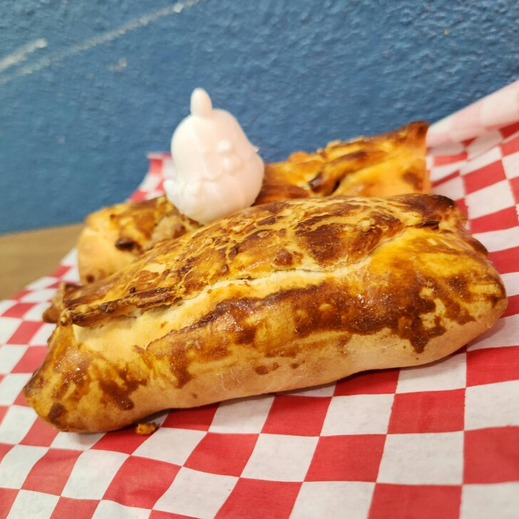 pan de la casa horneado y relleno de peperoni con queso y salsa de tomate, glaceado de huevo con queso parmesano