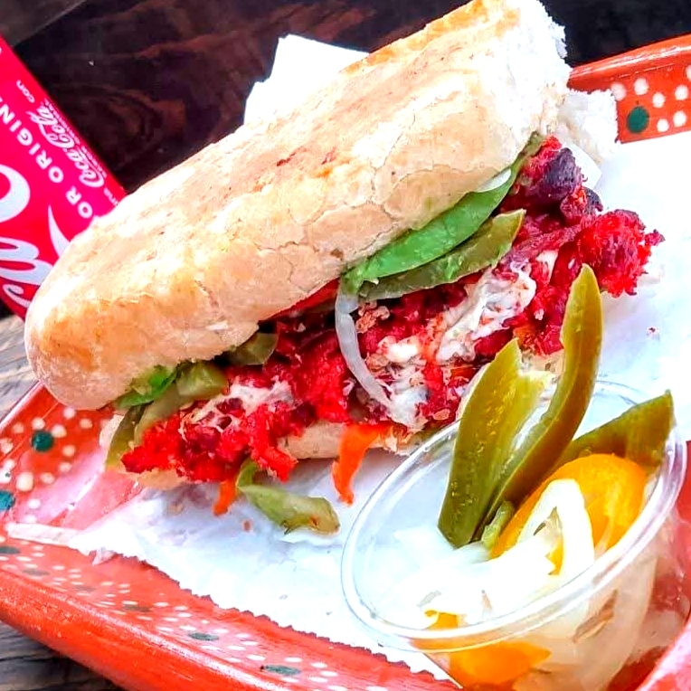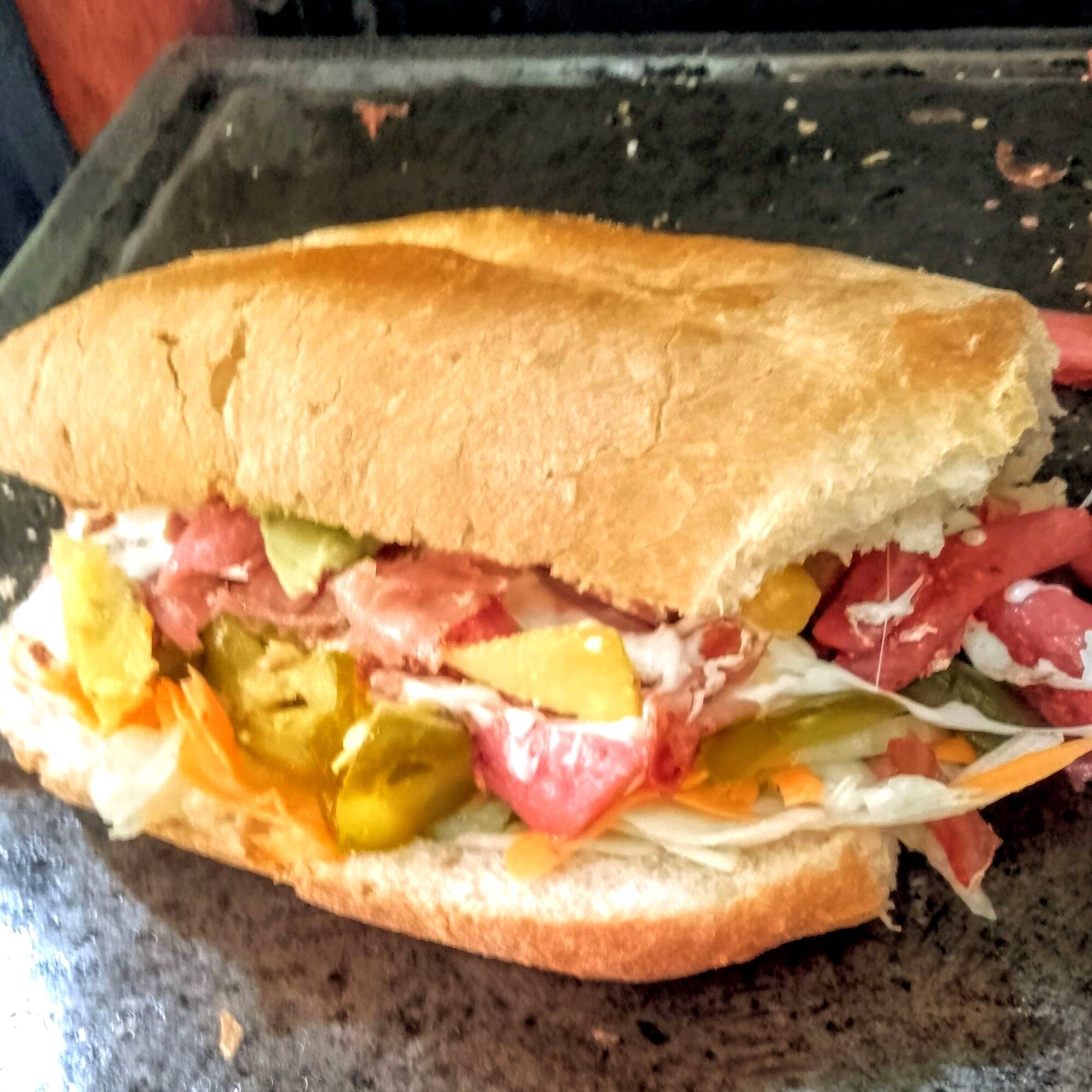 Pan del día, Chorizo, Jamón, Salchicha, y Tocino. Todos cubiertos de queso oaxaca. (Vegetales frescos y mayonesa opcionales). Lechuga, Zanahoria rayada, Jitomate, Cebolla, y Chile jalapeño.
