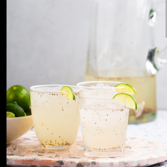 Agua fresca natural de limón con chía, preparada al momento y servida fría.