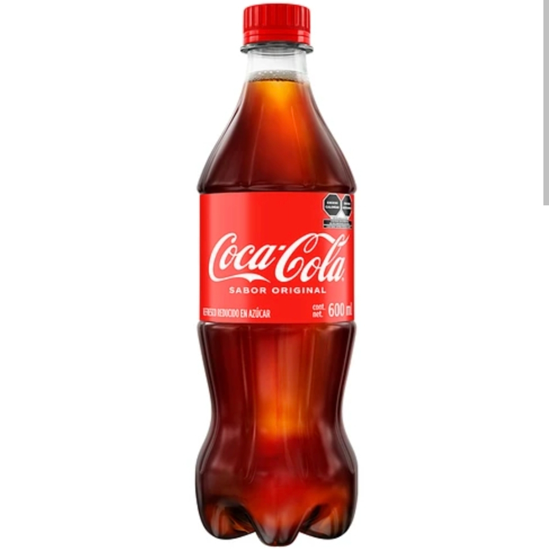 Refresco Coca-Cola original 600 ml, frío. Ideal para acompañar tus alimentos.