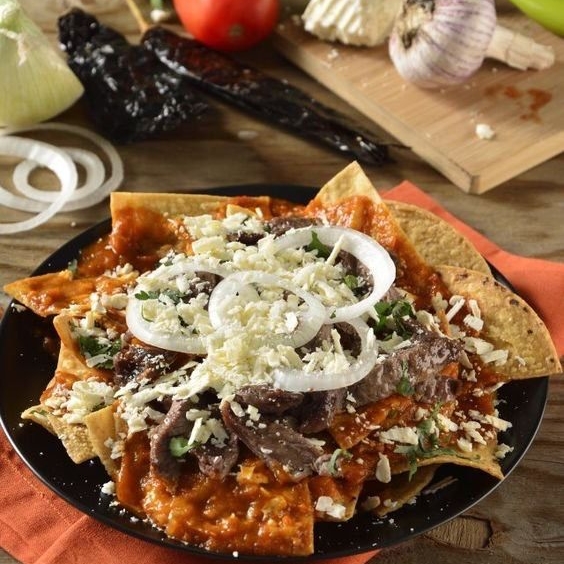 Chilaquiles tradicionales preparados al momento, con salsa a elegir, queso fresco, crema y cebolla. Incluye 100 g de bistec.