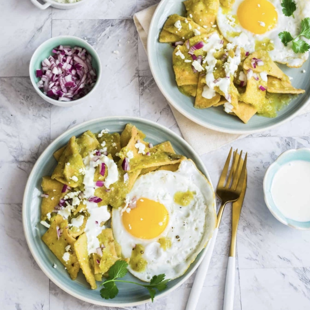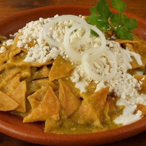 Chilaquiles tradicionales preparados al momento, con salsa a elegir, queso fresco, crema y cebolla.