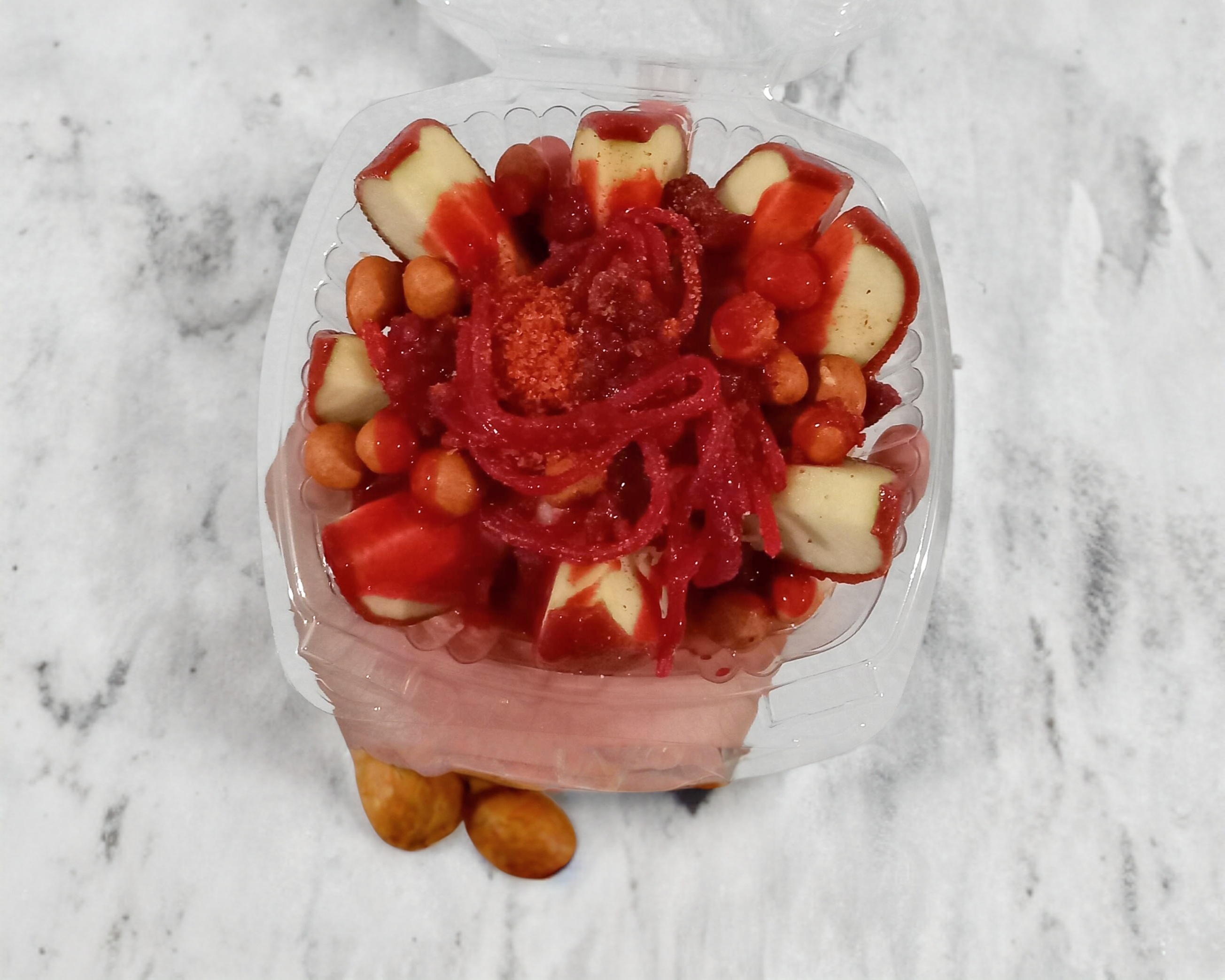 Forrada en una rica pasta de tamarindo, sobre una cama de jicama y zanahoria rallada, dulcesitos de tamarindo, panditas, cacahuates, chamoy y chilito en polvo.