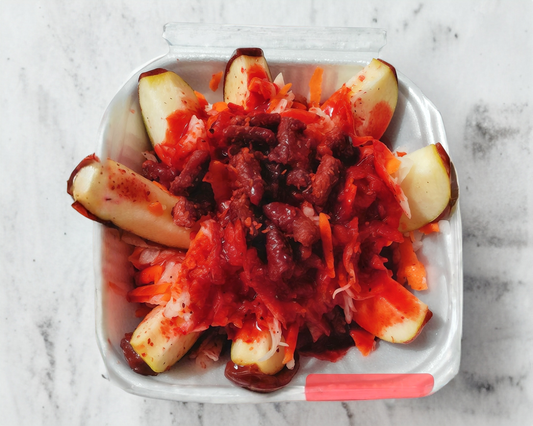 Forrada con una rica pasta de tamarindo, sobre una cama de jicama y zanahoria rallada, dulces de tamarindo, chamoy y chilito en polvo.