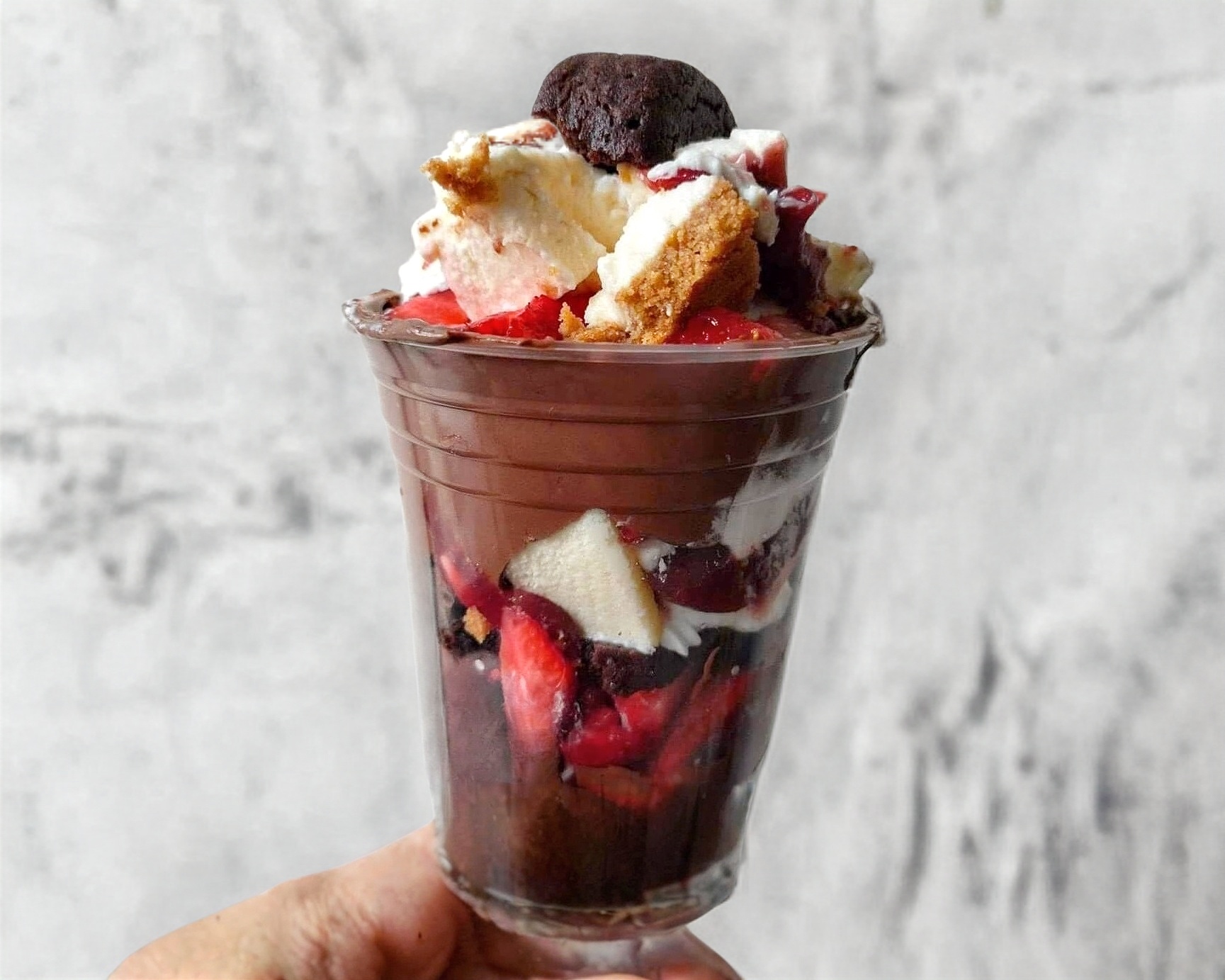 Fresas frescas con crema (receta de la casa) en vaso de 14 Oz (396 ml).