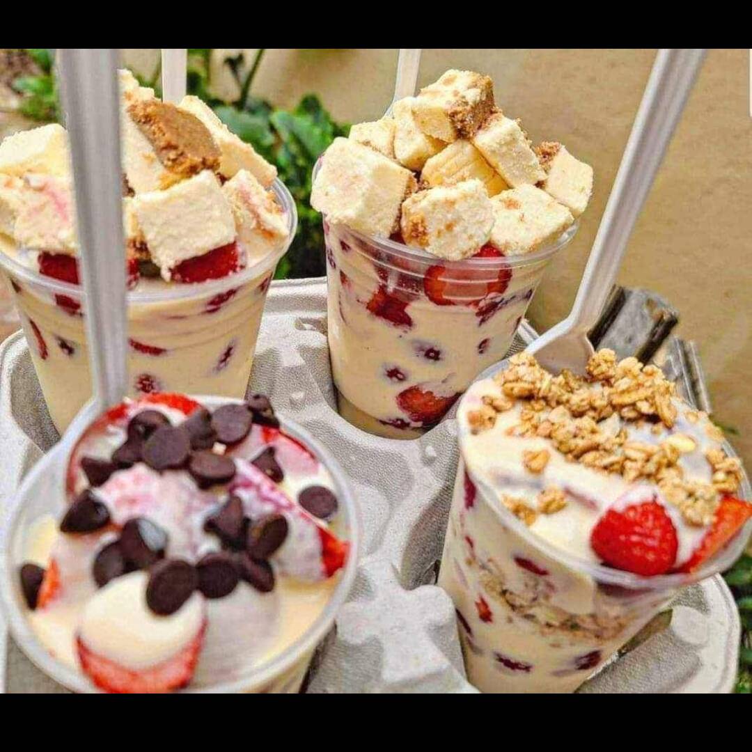 Fresas frescas con crema (receta de la casa) con trozos de cheescake de tu preferencia, en un vaso de 20 Oz (591 ml).