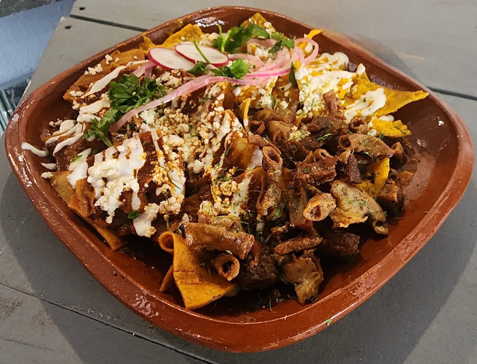 Deliciosos chilaquiles bañados en salsa cremosa de chipotle acompañados con frijoles refritos, crema, y queso