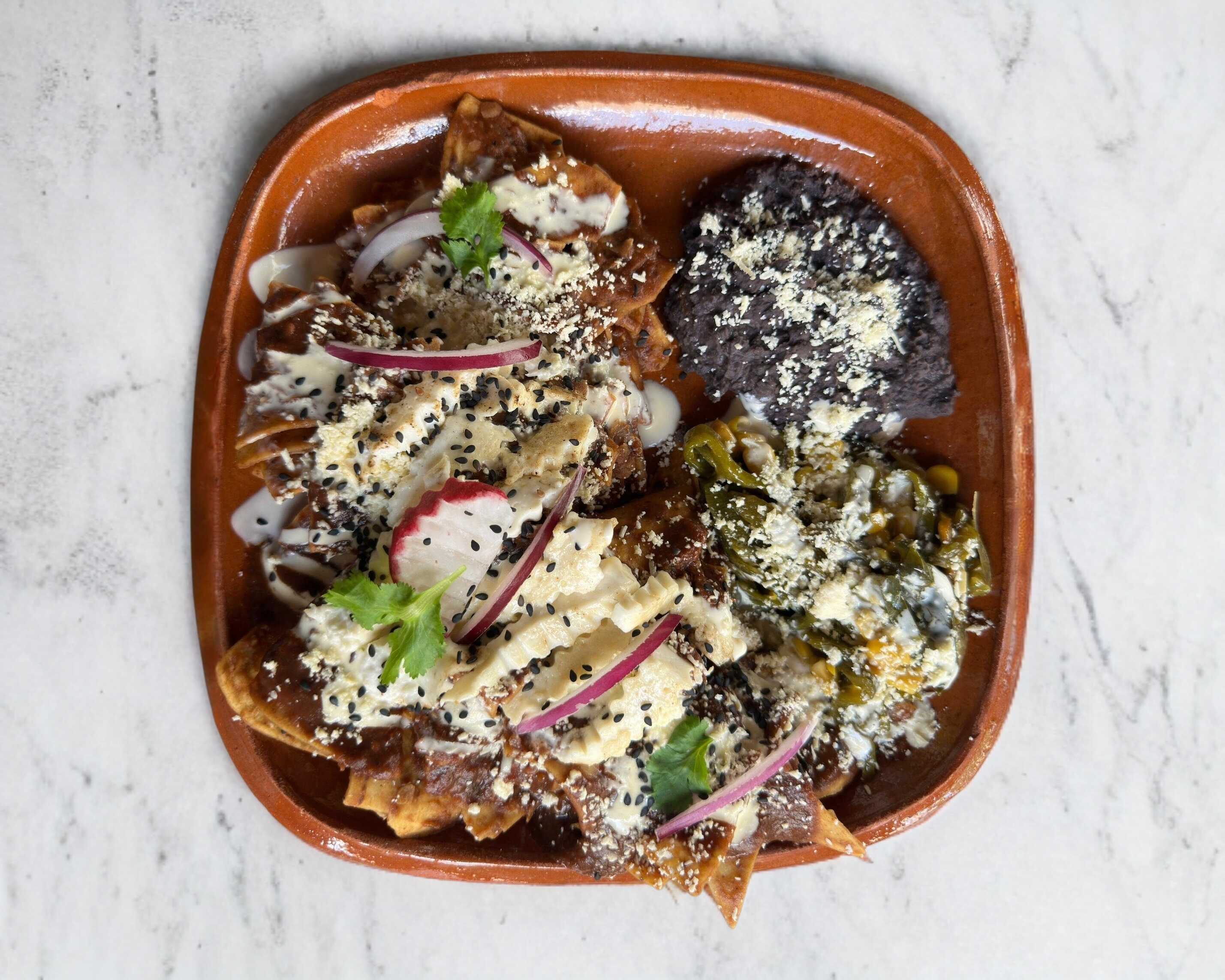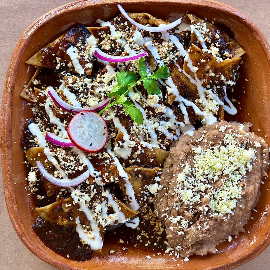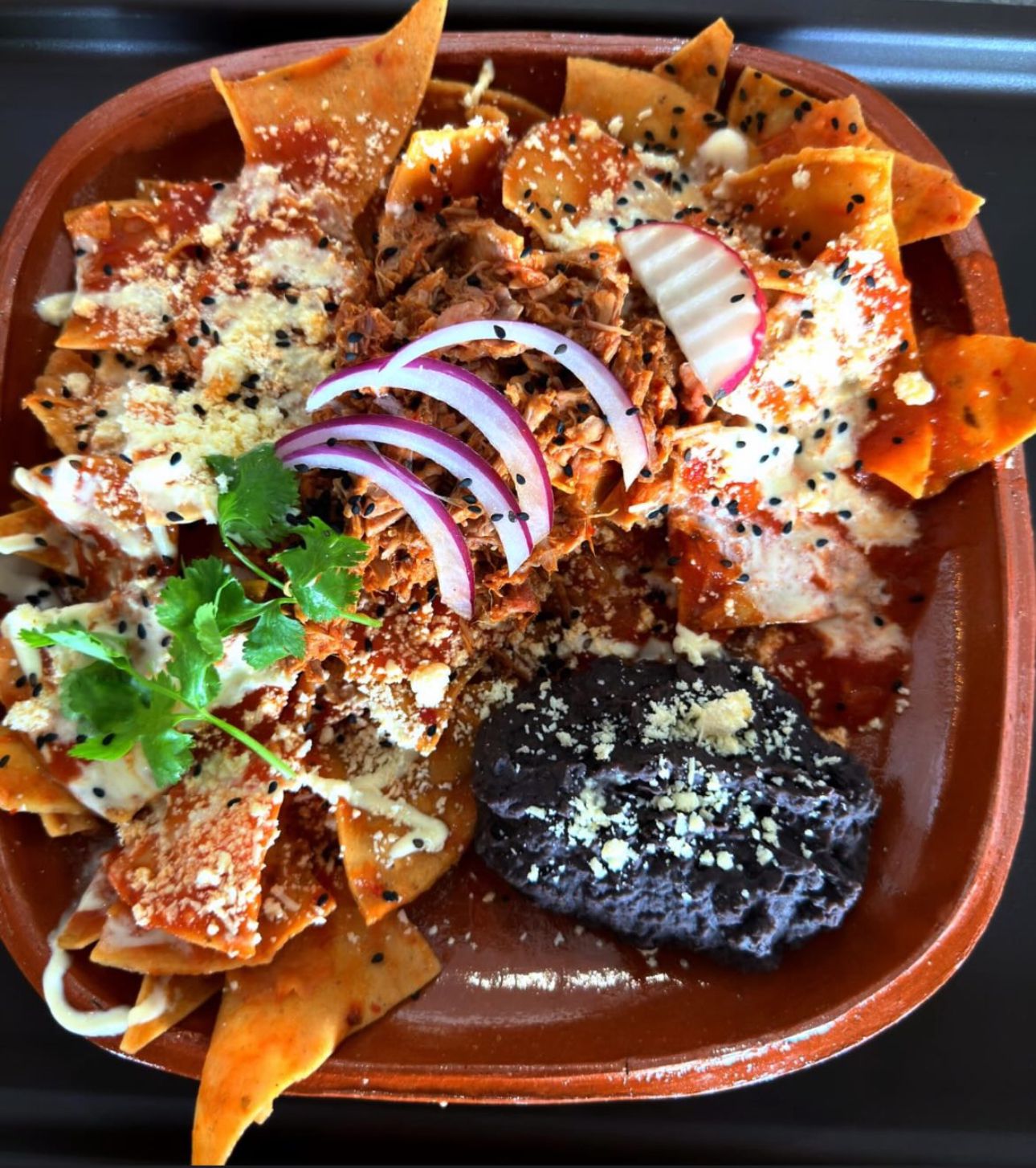 Deliciosos chilaquiles bañados en salsa de frijol con morita, acompañados de frijoles refritos, crema y queso