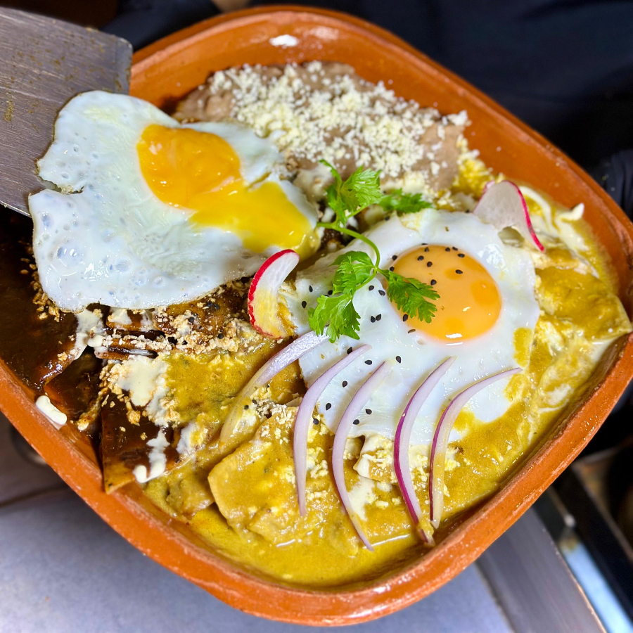 Deliciosos chilaquiles bañados en salsa negra, acompañados de frijoles refritos, crema , y queso.