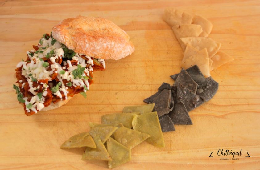 Bolillo relleno de chilaquiles con tu salsa favorita.