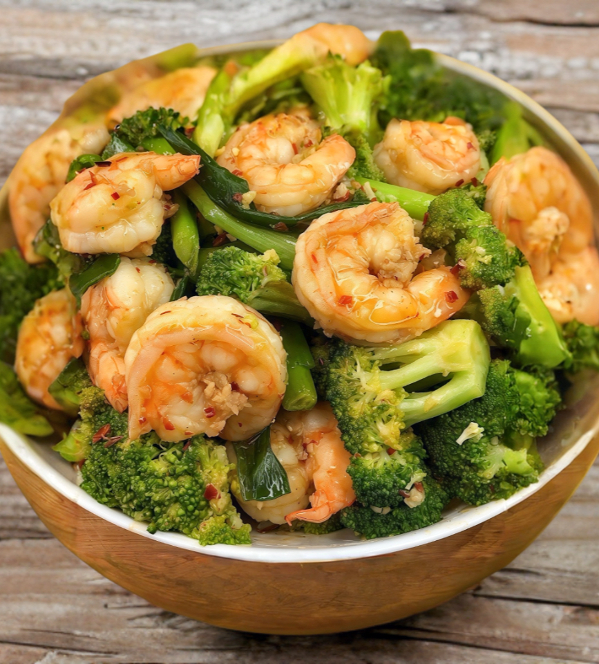 Camarones con brócoli en salsa de ostras (6 piezas).