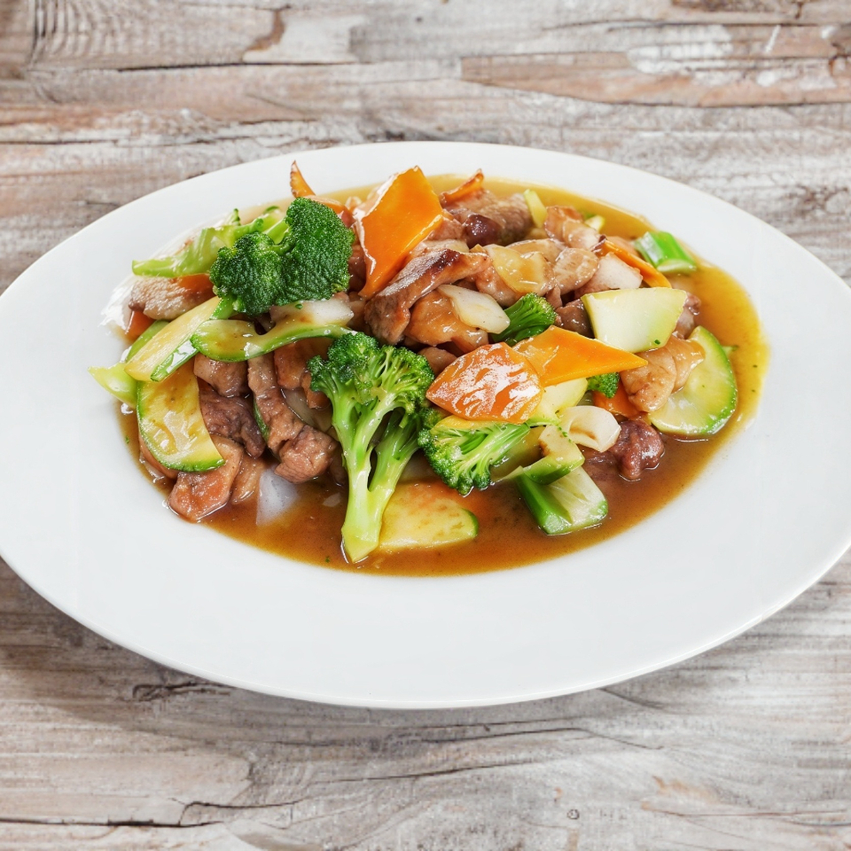 Carne de res marianada al estilo cantones con brócoli en salsa de ostras