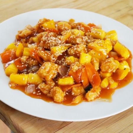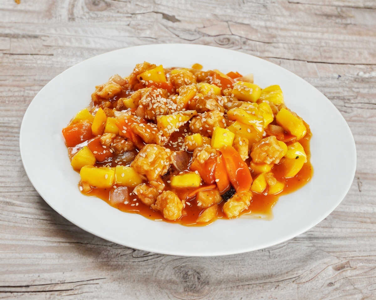 Trozos de pollo frito en salsa agridulce y piña.