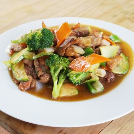 DELICIOSA CONVINACION DE VEGETALES EN SALSA DE HOSTION CON POLLO, RES Y CAMARON