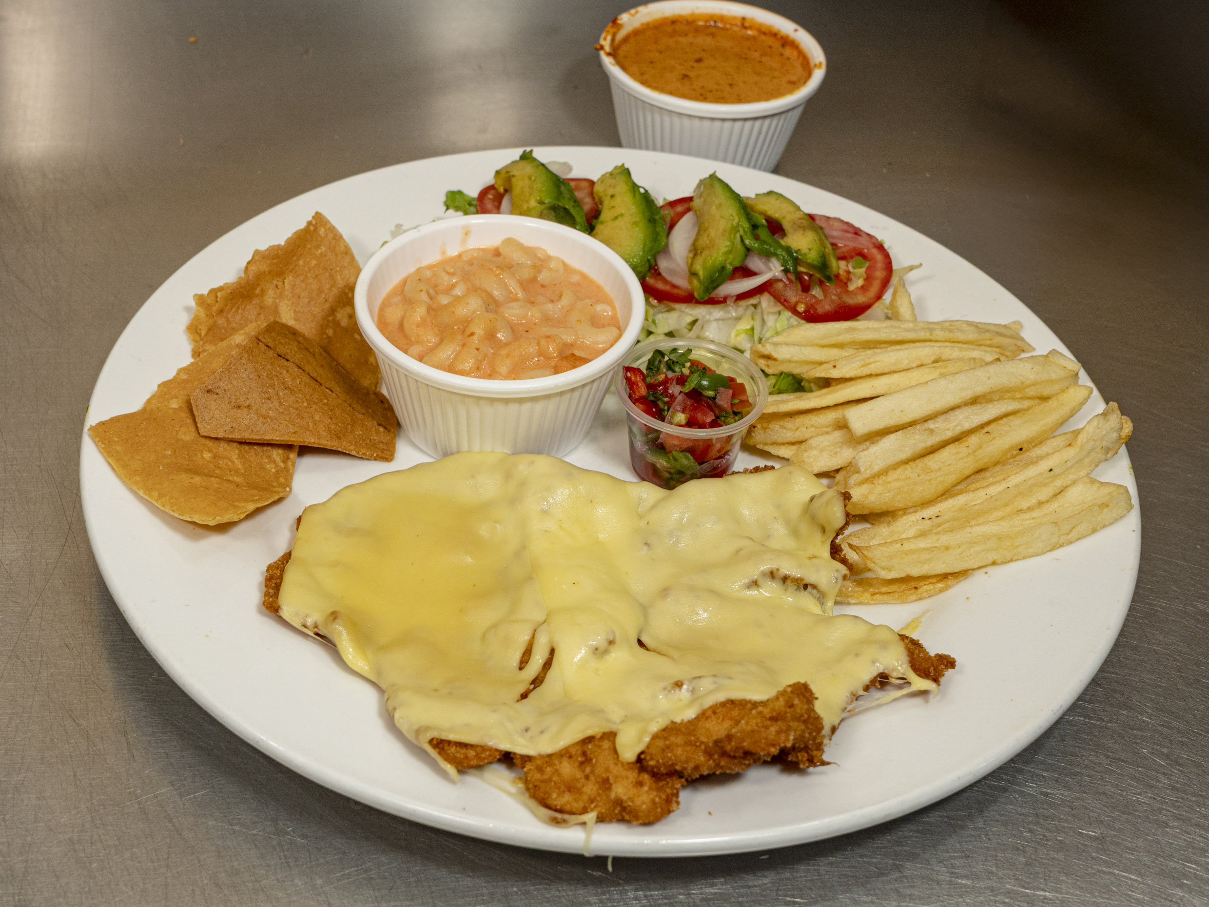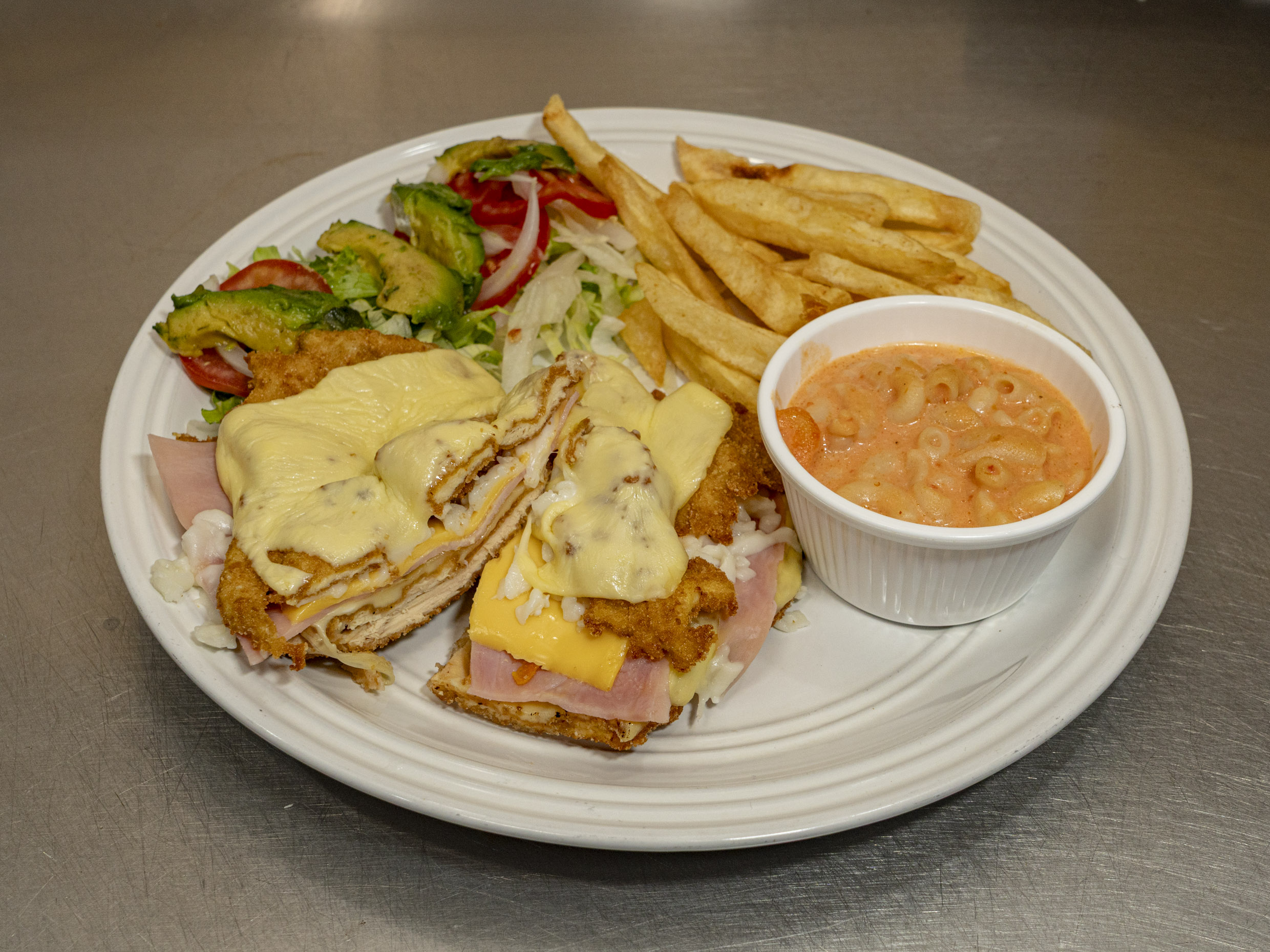 Pechuga empanizada con jamon y queso amarillo cubierta de queso manchego acompañada de ensalada, arroz o Spaguetti y papas