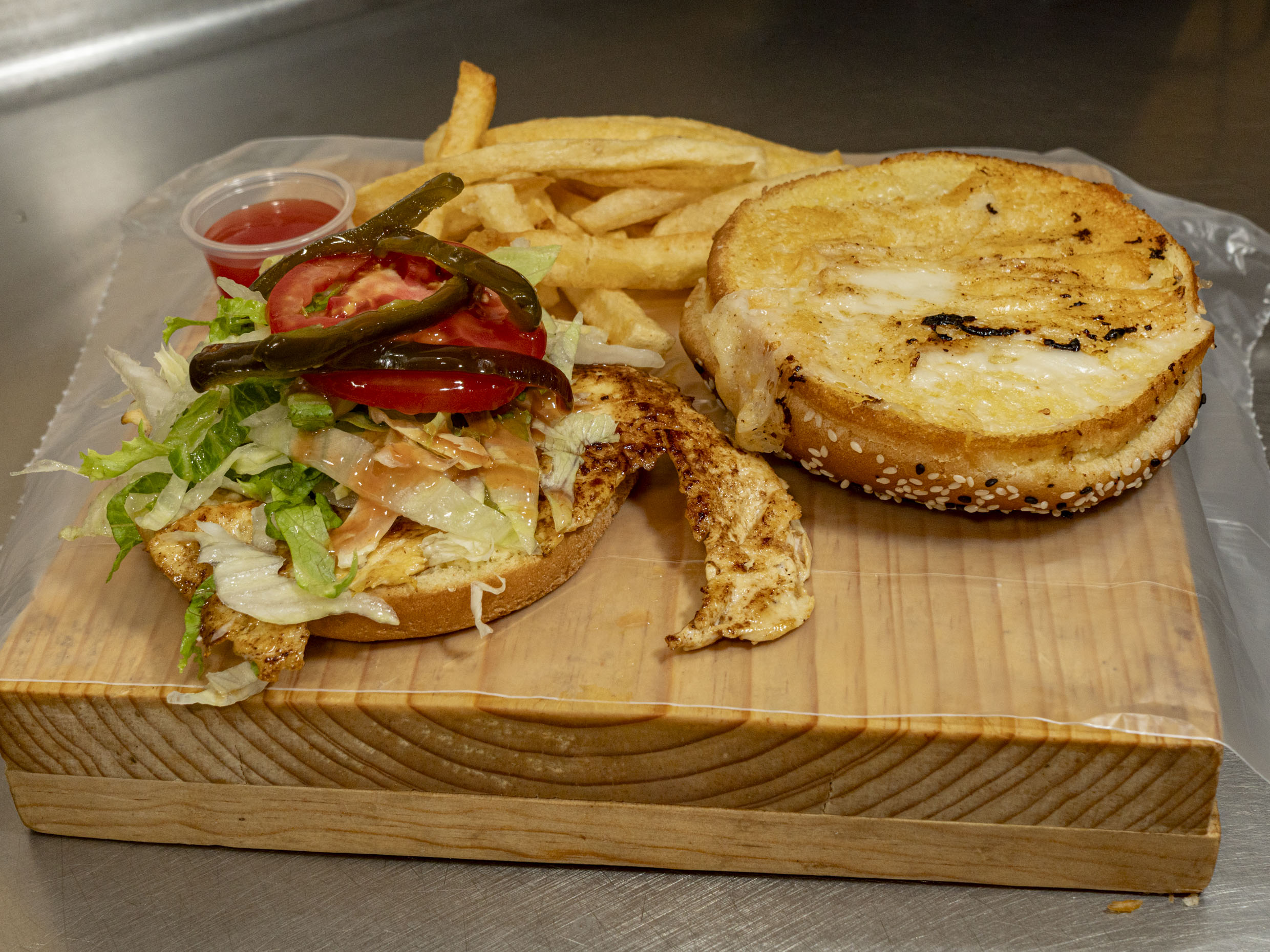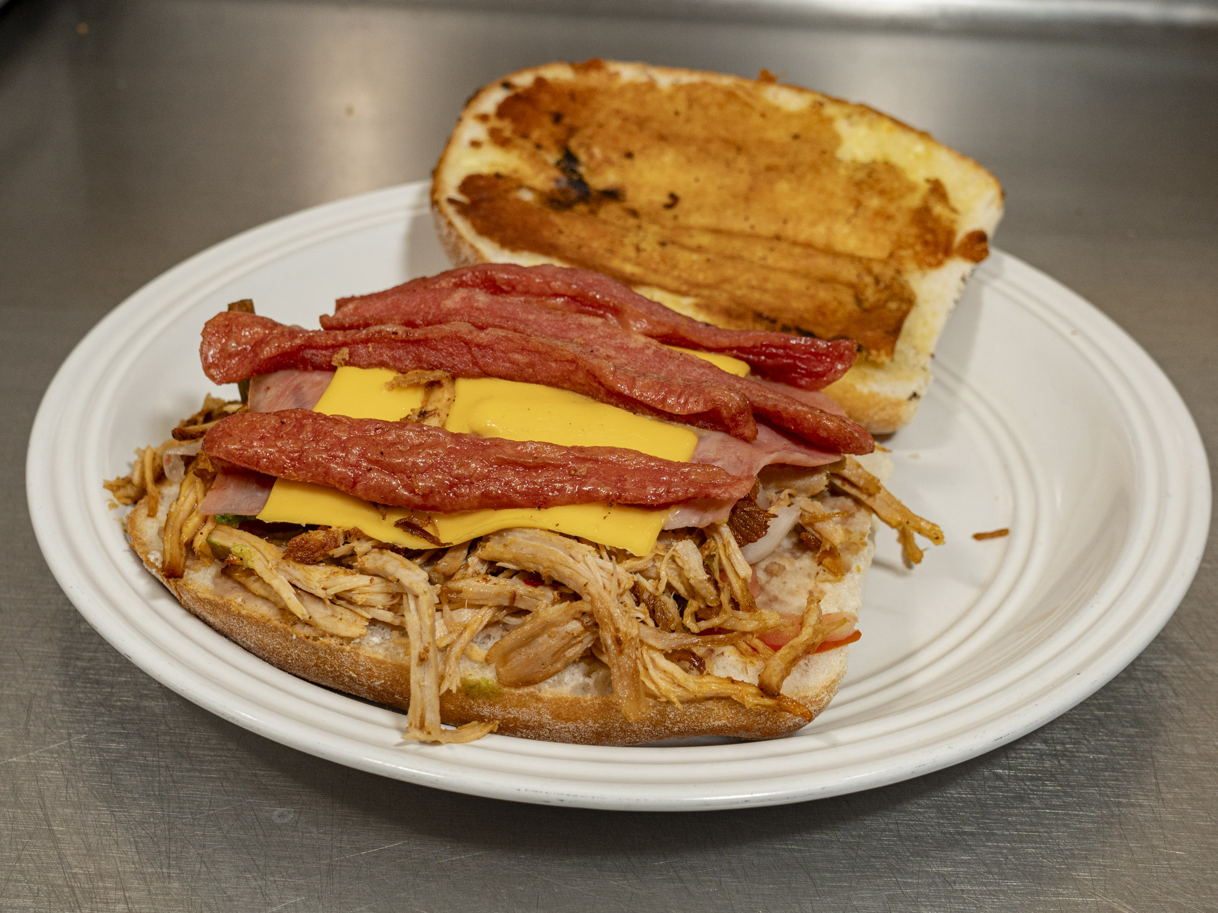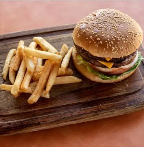Carne de res, queso americano, jamón y piña asada, incluye papas y bebida.