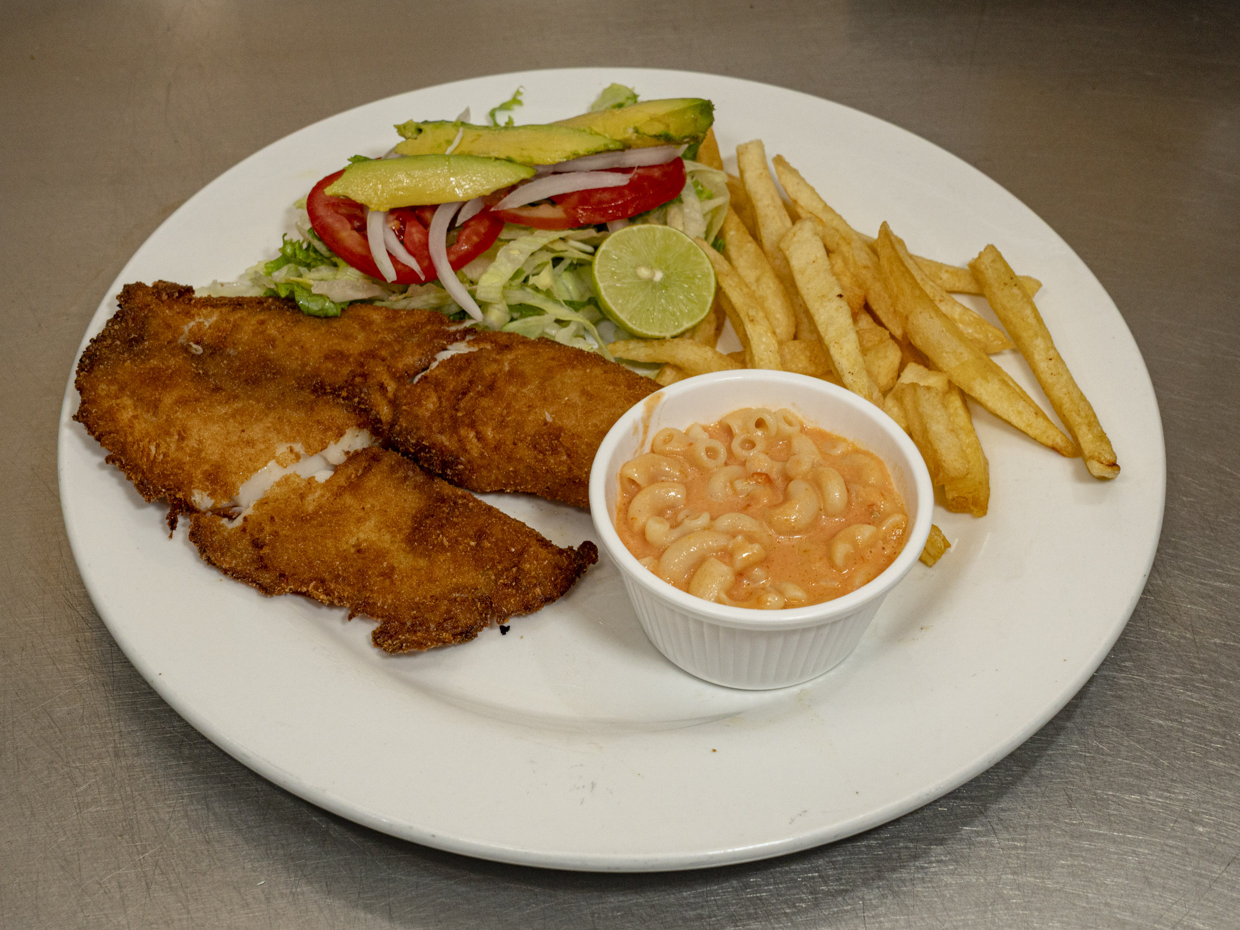 Filete de pescado empanizado con dos guarniciones y bebida