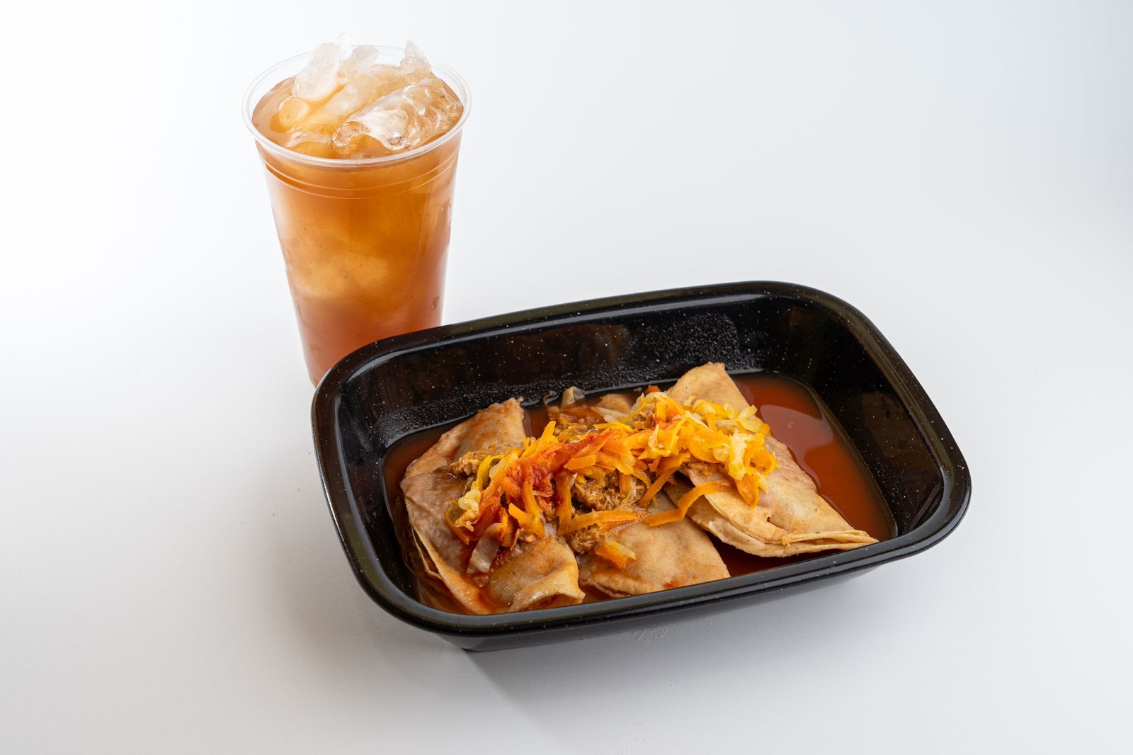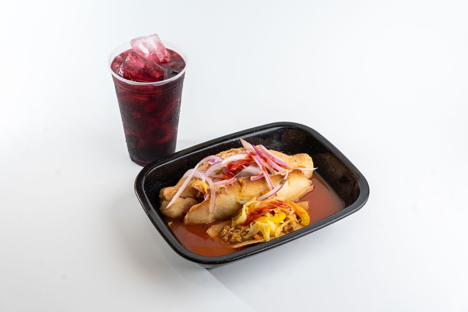 Tres tacos ahogados y agua de sabor.