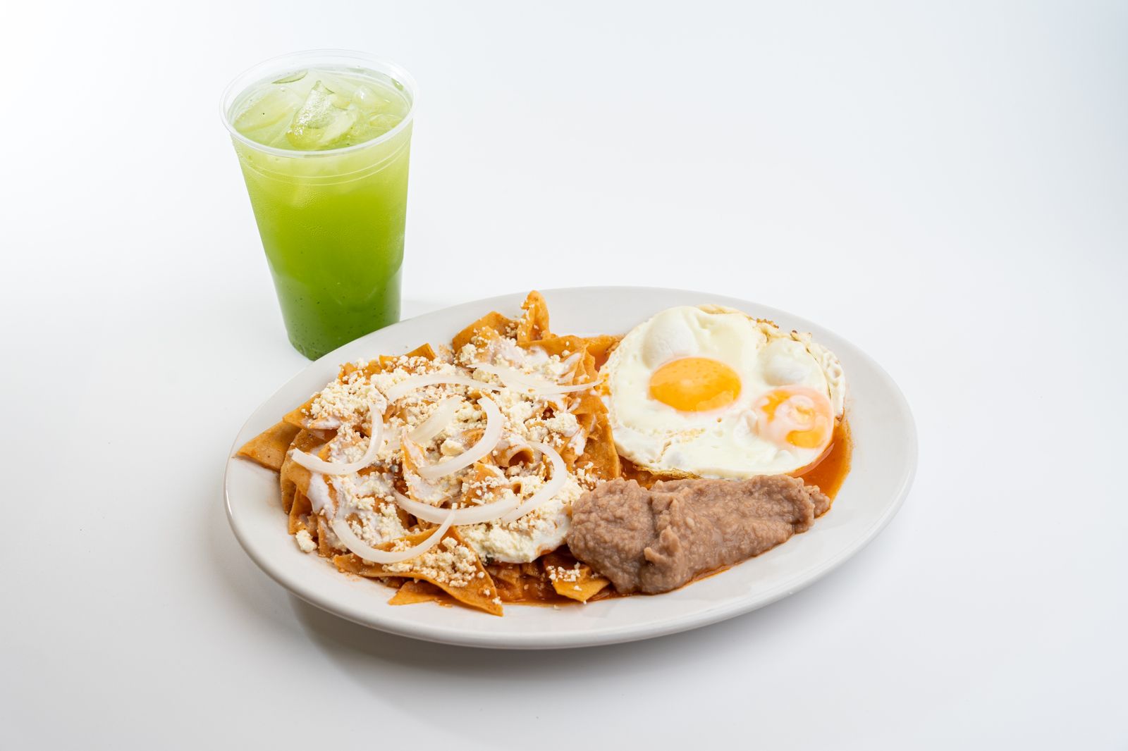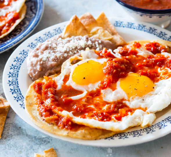 Chilaquiles rojos o verdes con huevos revueltos o estrellados y frijoles.