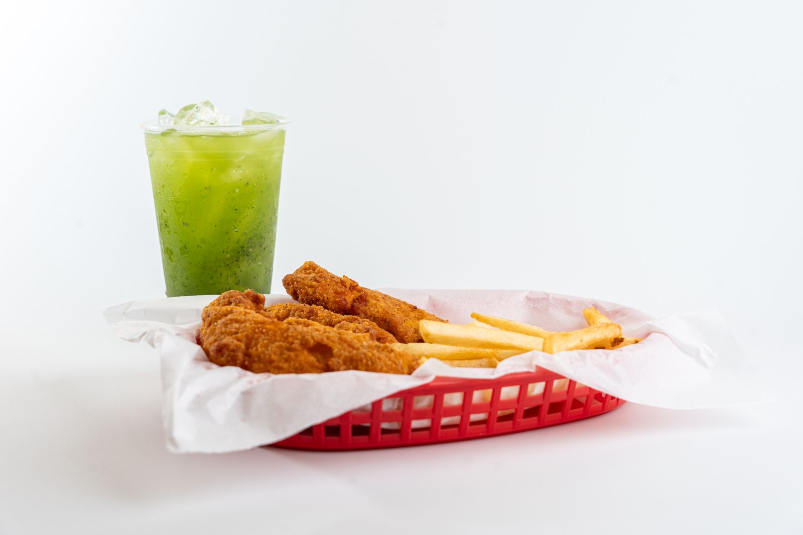 Cuatro piezas de tenders con papas y agua de sabor.