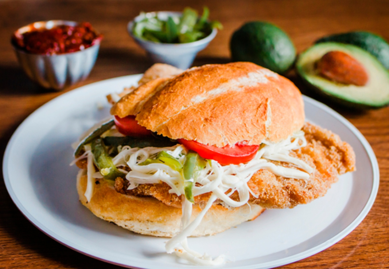 Pan tradicional elige tu milanesa de res o pollo, incluye jitomate, lechuga, cebolla, chile en vinagre, aderezos. guacamole o aguacate según disponibilidad, frijoles y queso. Platillo personal