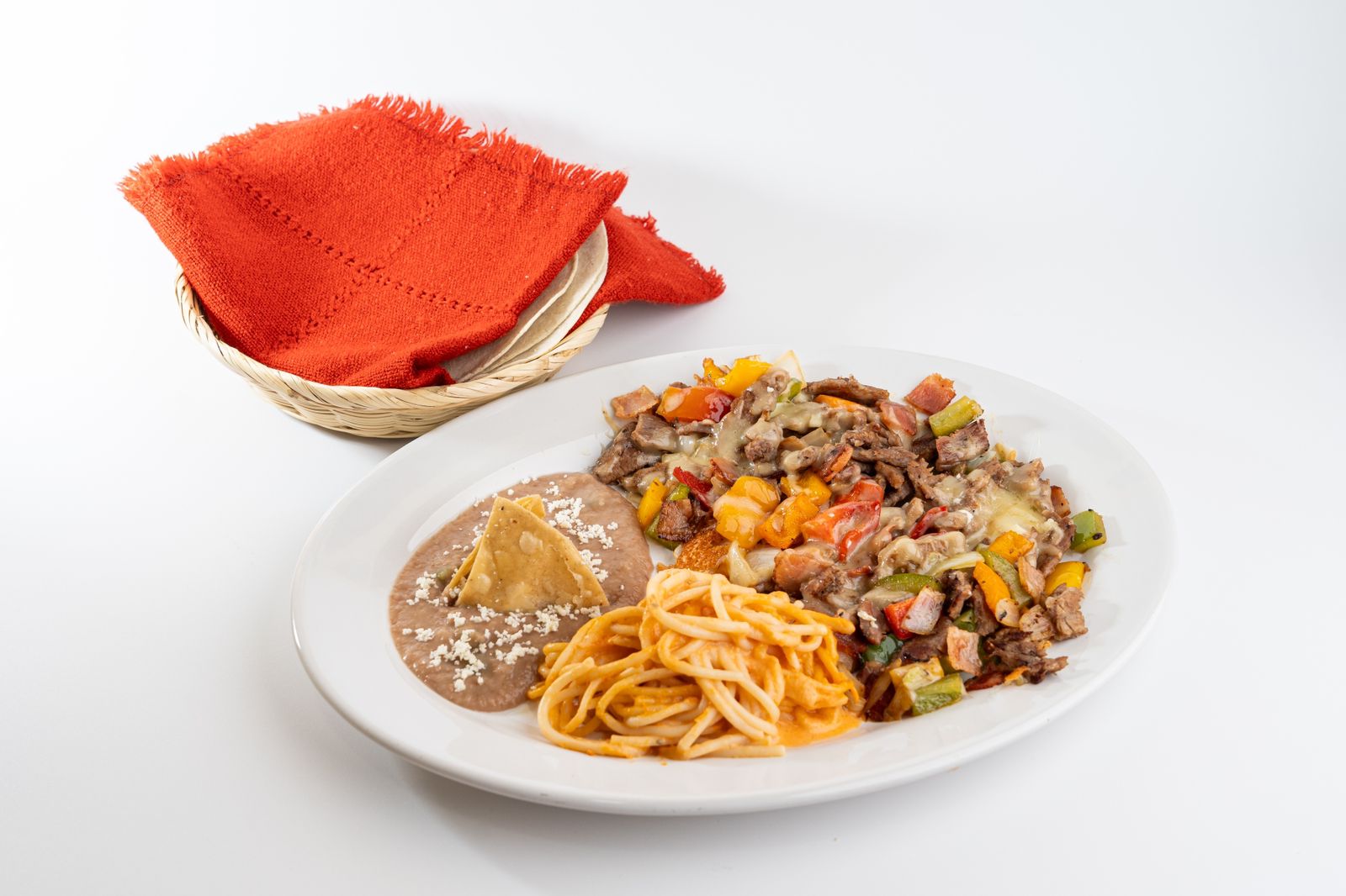 Pollo o bistec, con pimientos, tocino, queso manchego y 2 guarniciones a elegir.