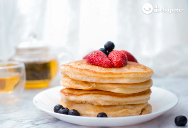 Dos piezas de hotcakes de 20 cm, mantequilla y miel de maple.