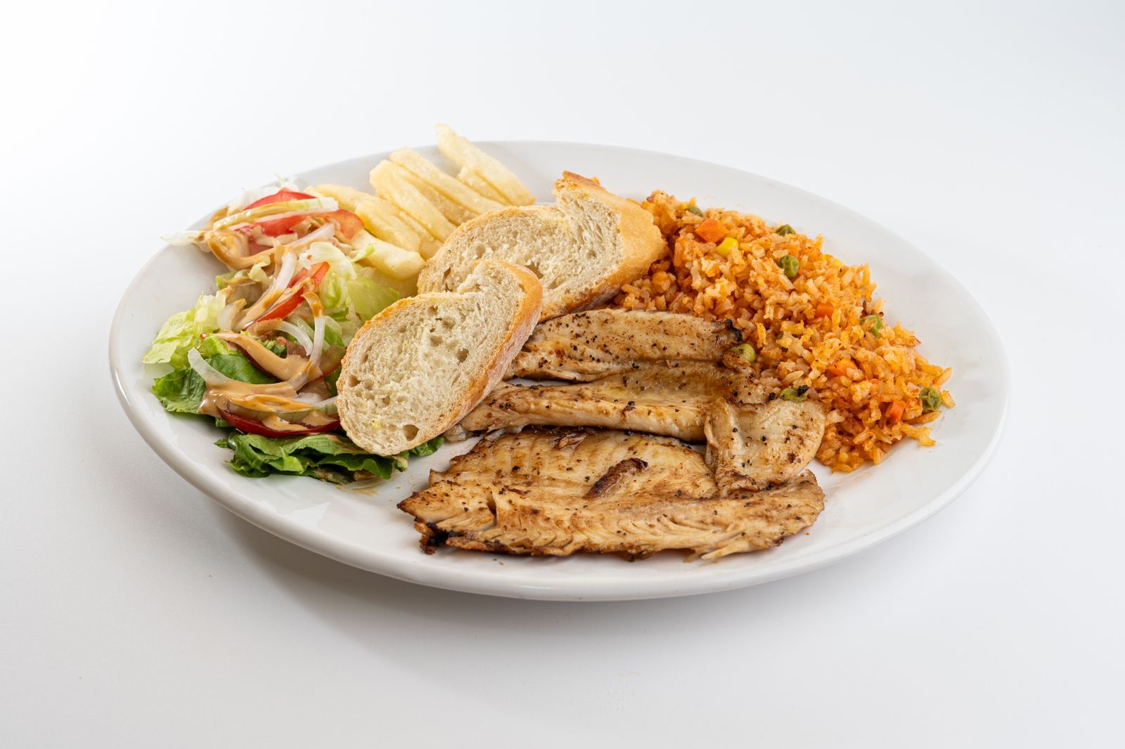 Empanizado o a la plancha, ensalada, papas y 2 guarniciones.