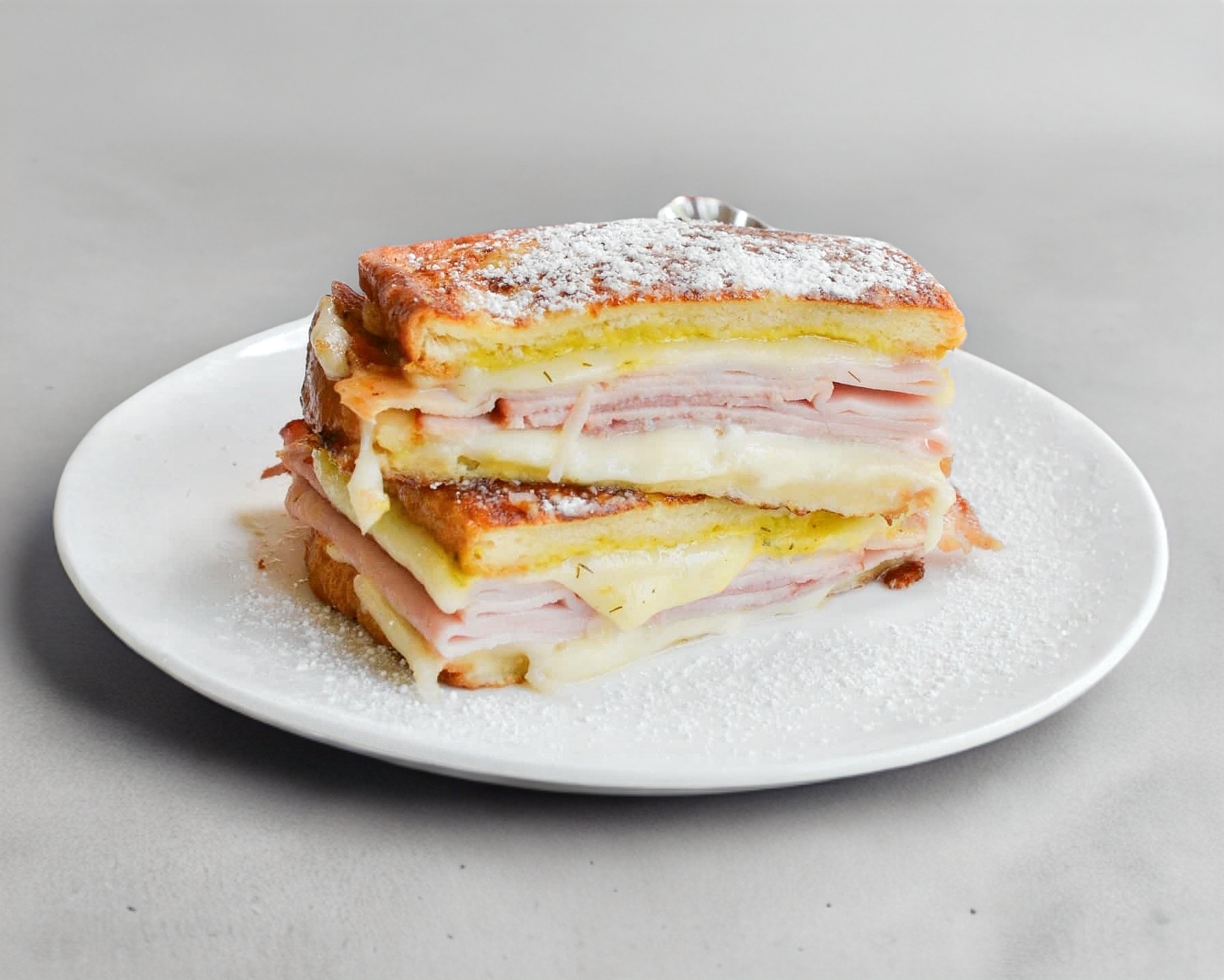 Sándwich montecristo, porción de papas a la francesa. De queso.