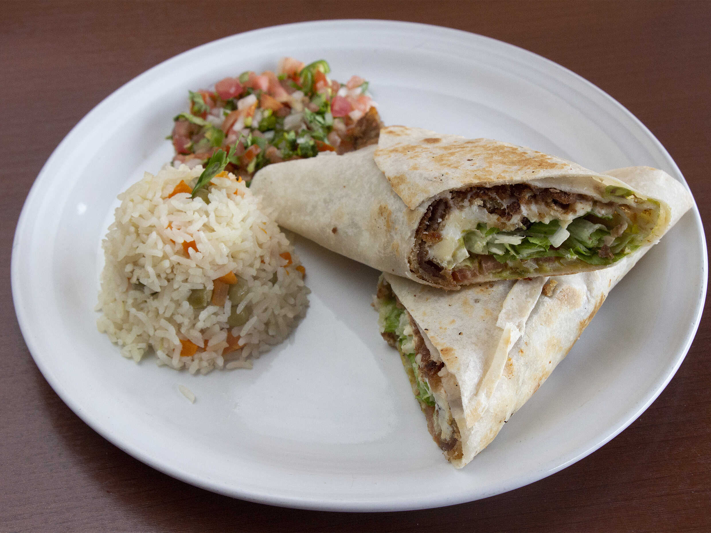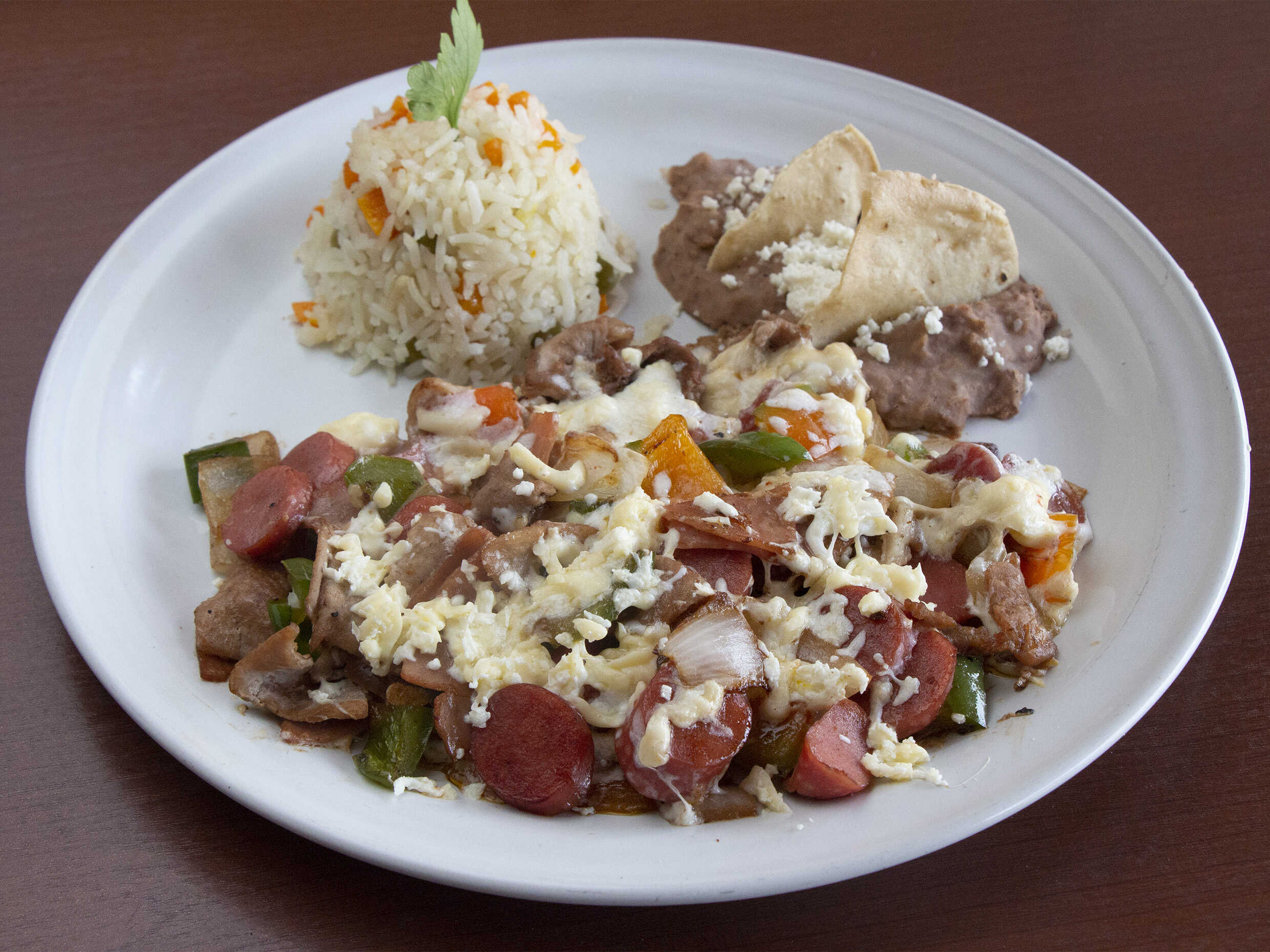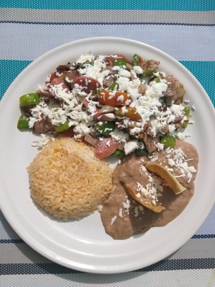 Carne, pimiento morron, cebolla, jamon y salchicha. Acompañado de arroz y frijoles