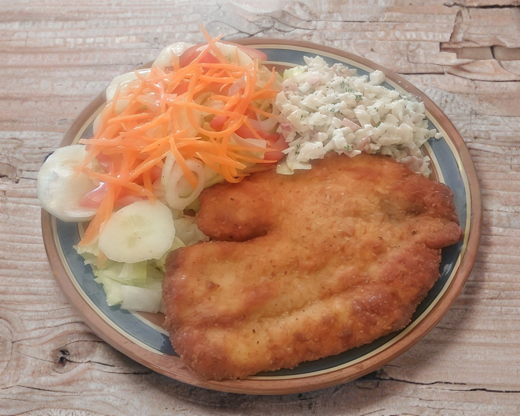200grs aprox, de Milanesa de Cerdo Empanizada, Guarnición de Sopa fría, 4 Tortillas, Salsa y con Ensalada de repollo.