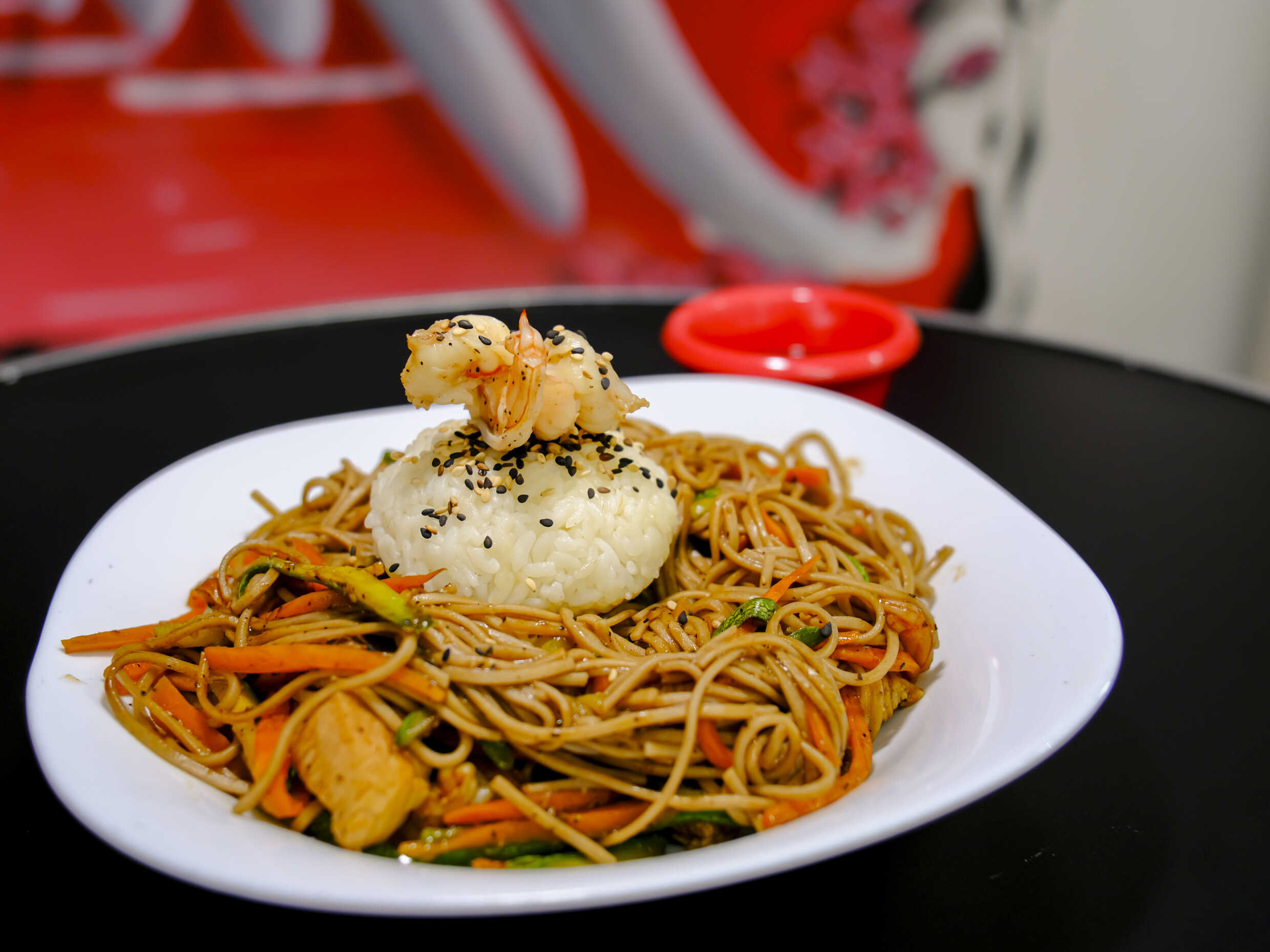 Pasta agridulce japonesa con verdura a la juliana con camaron. aderezado con kushiage. soya adicional.