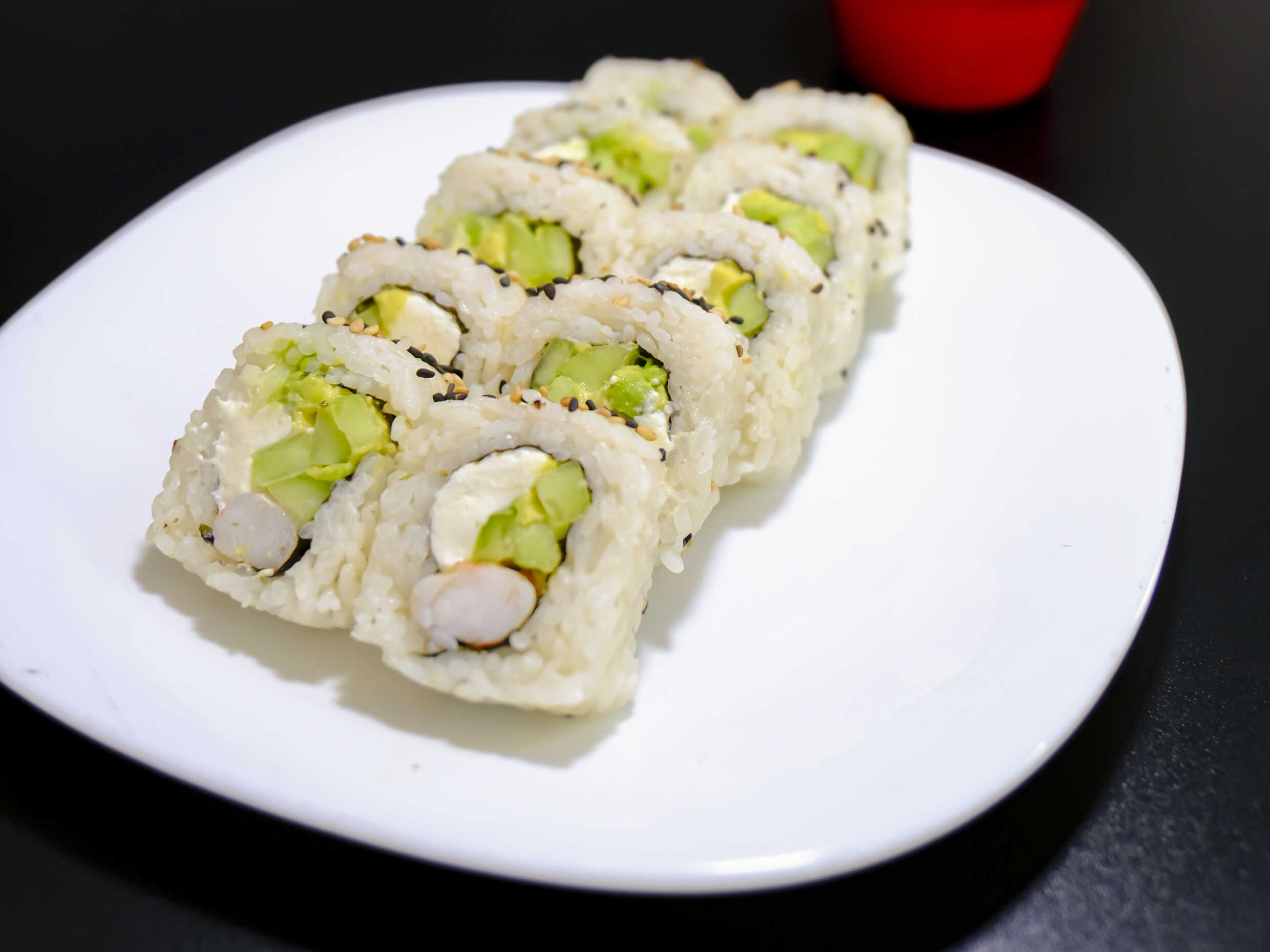 Camarón, aguacate, pepino, Philadelphia. soya adicional.